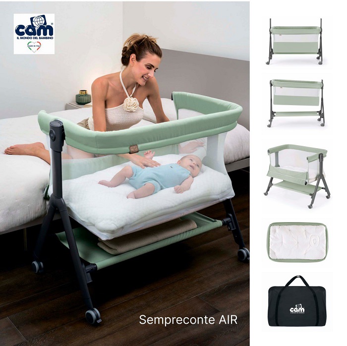 Колыбель CAM Sempreconte Air (Кам семпресонте аир ) - приставная кроватка для ребенка с рождения до 9 кг с максимально открытым пространством. Вам прекрасно будет видно ребенка со всех сторон, а у ребенка в люльке будет прекрасная циркуляция воздуха. Кроватка создана, чтобы организовать гигиеническое, безопасное и комфортное спальное место для ребенка, куда бы вы ни пошли.