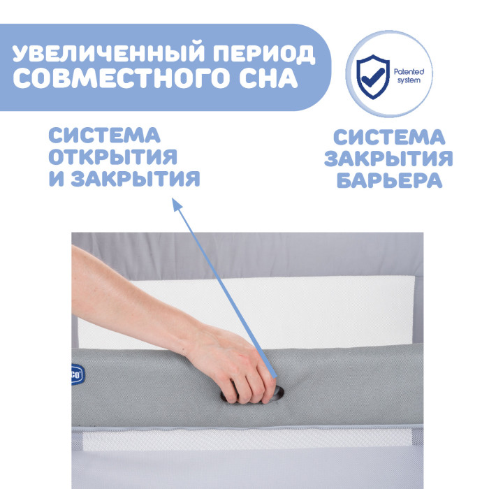 - Запатентованная система предотвращает боковую панель от того, что она останется открытой в случае, если кроватка не полностью прикреплена к родительской кровати