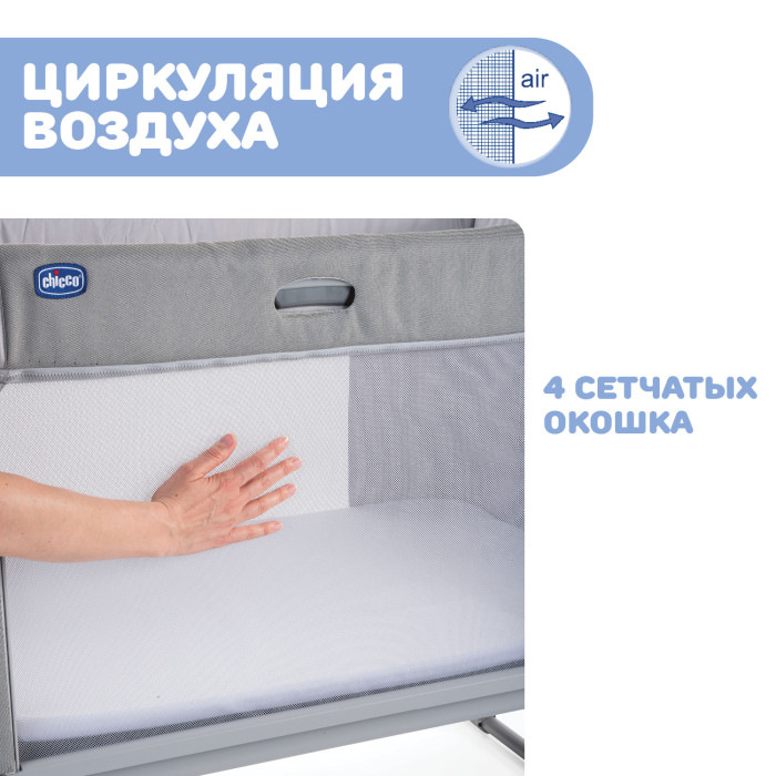 - Воздухопроницаемая. Сетчатые окошки на всех сторонах гарантируют отличную вентиляцию в кроватке