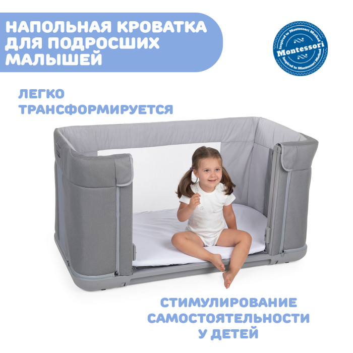 - Напольная кроватка для подросших малышей. Благодаря съёмным ножкам и боковой панели, детки постарше легко могут сами заходить и выходить из кроватки, стимулируя, таким образом, свою самостоятельность и независимость