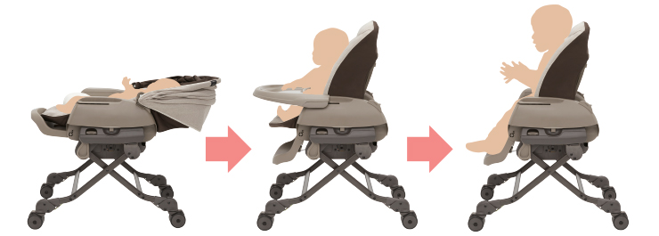 с 6 месяцев можно использовать как стульчик для кормления, который имеет 5 положений наклона спинки и подножки;