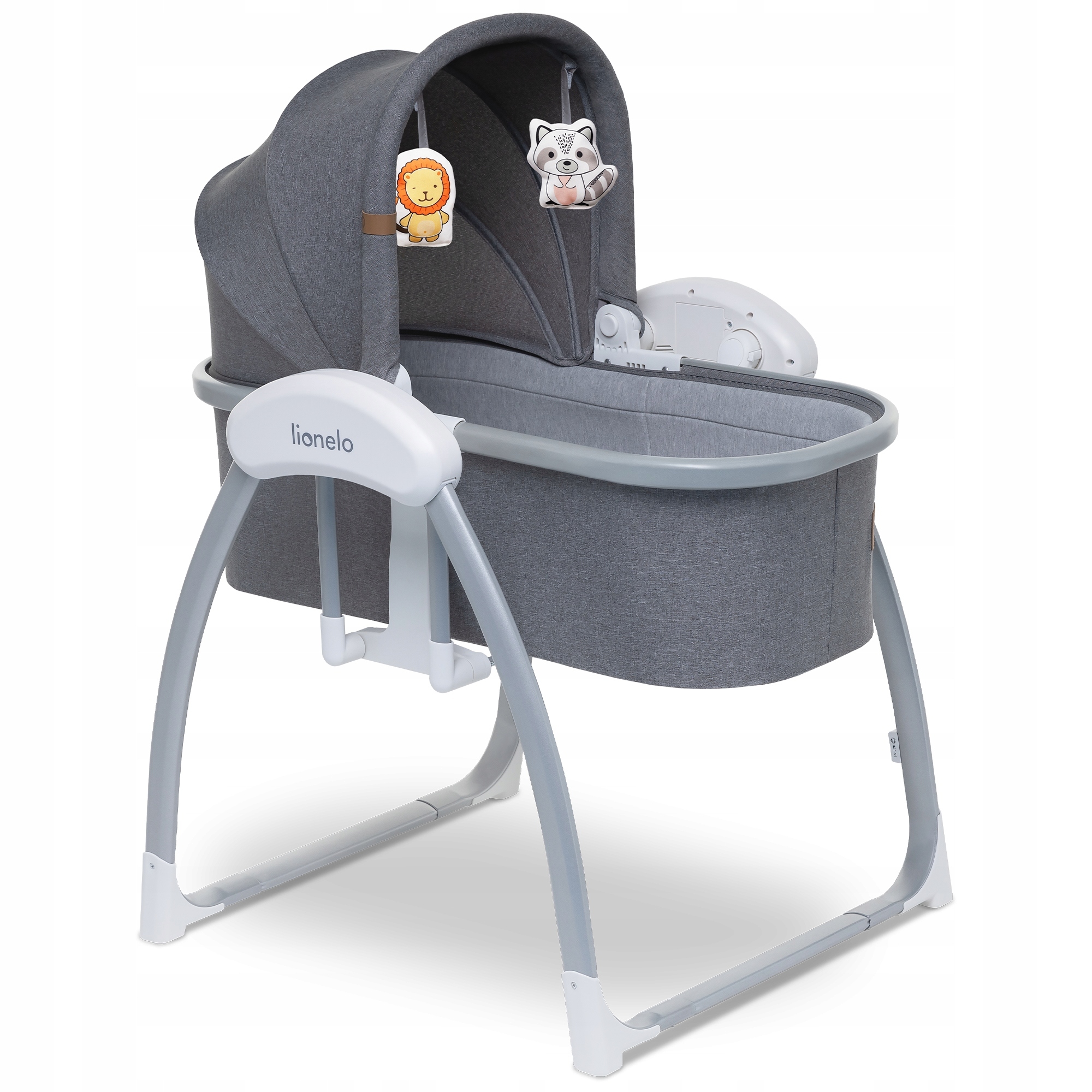 Колыбель Lionelo LO-FIGGY (Лионело Ло Фигги) - детская кроватка для ребенка с рождения до 9 кг с функцией автоматического качания. Плавное покачивание вперед-назад позволит ребенку чувствовать себя спокойно, быстрее засыпать и дольше спать. Просторное спальное место имеет абсолютно ровное дно, что считается наиболее подходящим положением для ребенка в младенчестве. Дополнительно предусмотрена небольшая подушечка для более комфортного положения новорожденного. Колыбельку можно использовать не только для развлечения ребенка, но и для полноценного сна. Дополнительно колыбелька оснащена капюшоном для создания спокойно атмосферы вокруг крохи. Есть две игрушечки для развития тактильных ощущений ребенка.