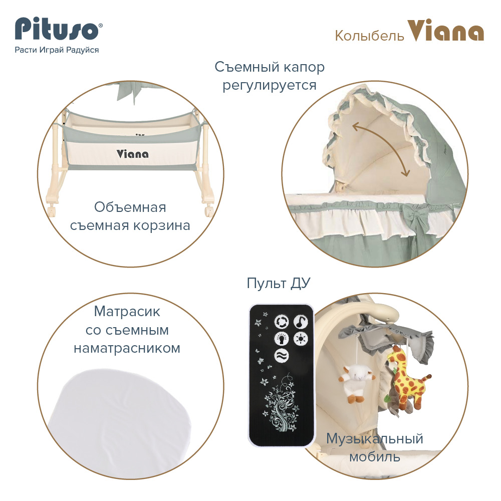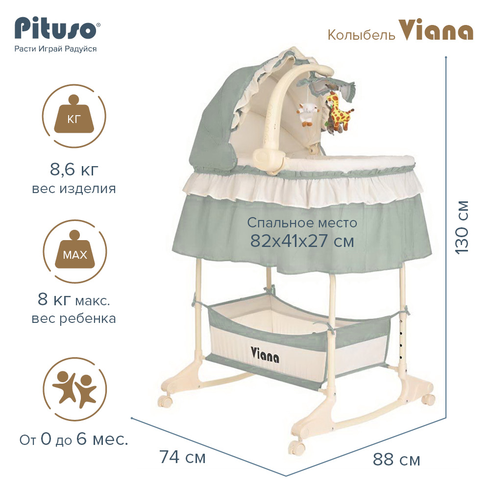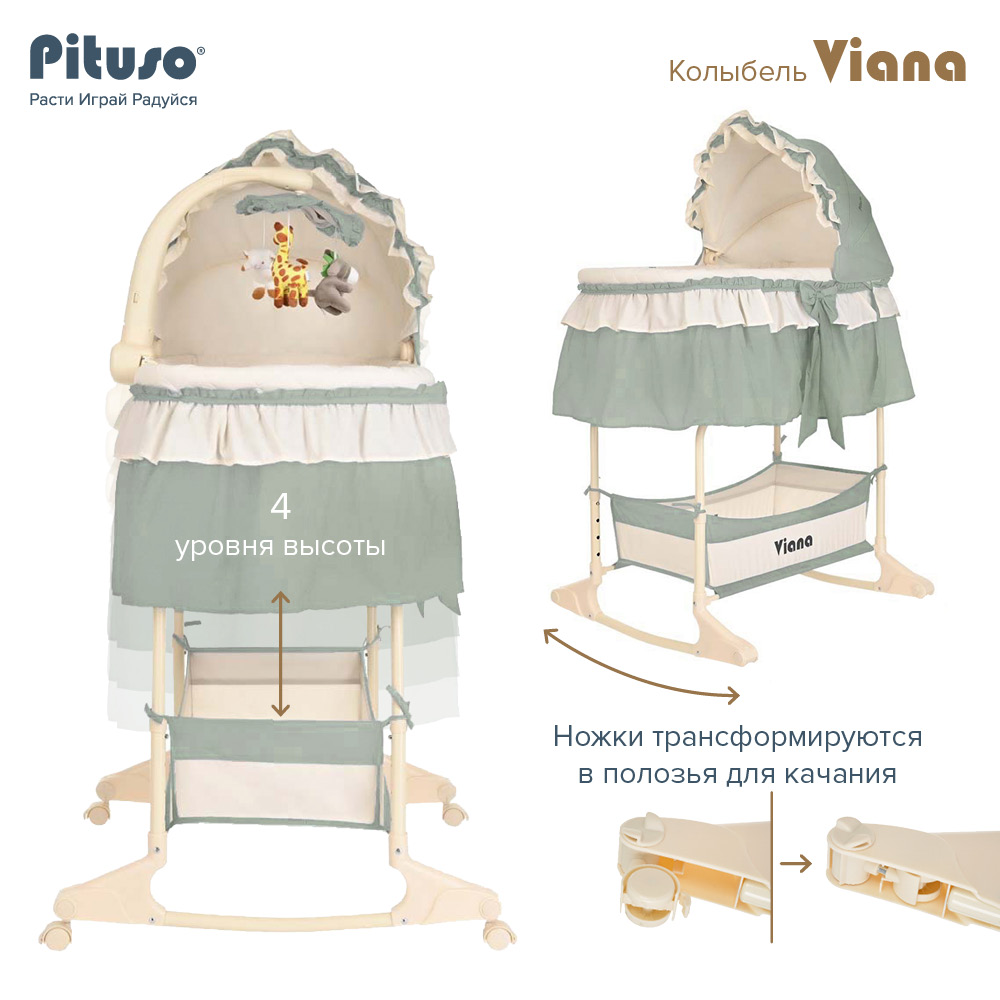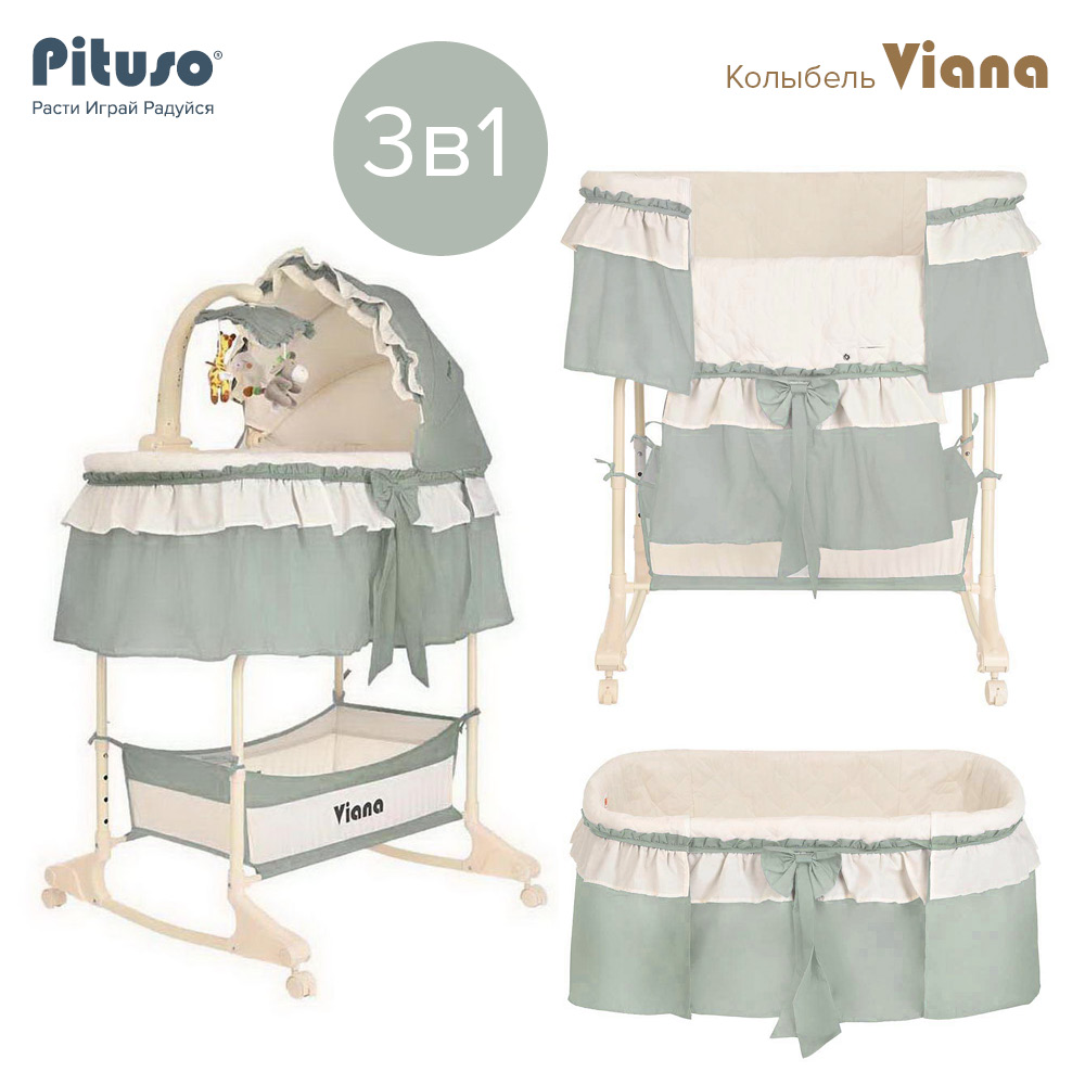 Колыбель-качалка PITUSO Viana 3 в 1 (Питусо Виана) - красивая и функциональная кроватка для новорожденного ребенка. Модель объединяет в себе: колыбель, приставную кроватку и съемную люлечку. Колыбелька рекомендована к использованию с рождения до 8 кг, примерно до 5-6 месяцев (пока малыш не научился самостоятельно переворачиваться, садиться и вставать на ножки).