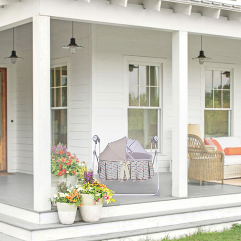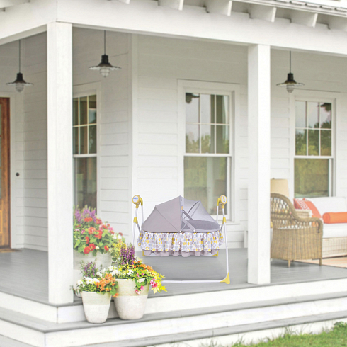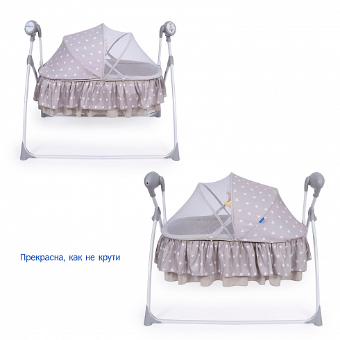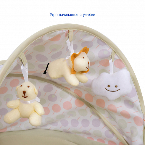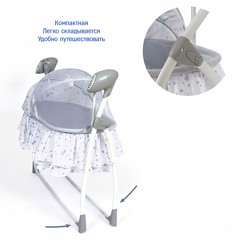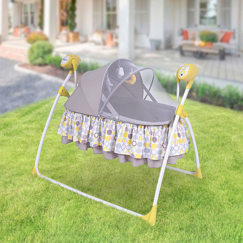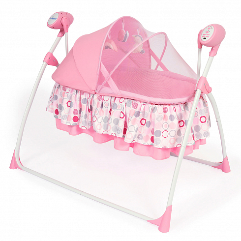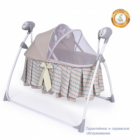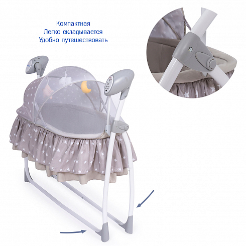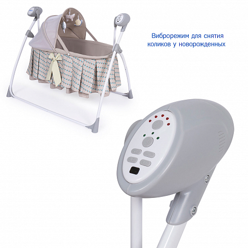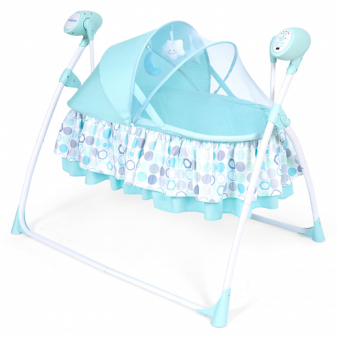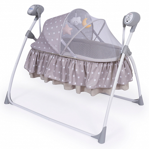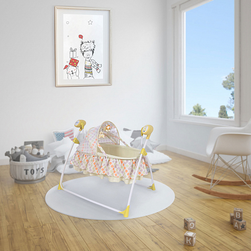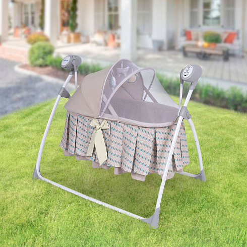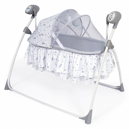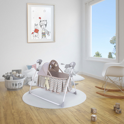 2. Колыбель-качалка для новорожденных с электронной системой укачивания. Электронный маятник выполняет размеренные движения в поперечном направлении, аналогичные движению человеческих рук. Настройки Simplicity 3020 Auto позволяют установить время качания, уменьшить или увеличить скорость, максимально учитывая характер и предпочтения ребенка. На дуге имеются 3 подвесные игрушки. Музыкальный мобиль проигрывает приятные мелодии (16 композиций и 5 звуков природы).