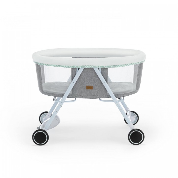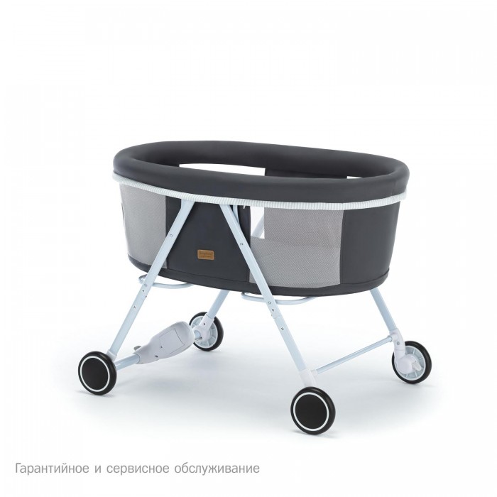 Каркас колыбели выполнен из трубчатого стального профиля, покрытого порошковой краской, и ударопрочного пластика. На верхней части каркаса имеется мягкая противоударная накладка, которая одновременно является декоративной деталью. Колесики снабжены стопорами, позволяющими зафиксировать колыбель в неподвижном состоянии.