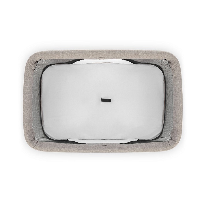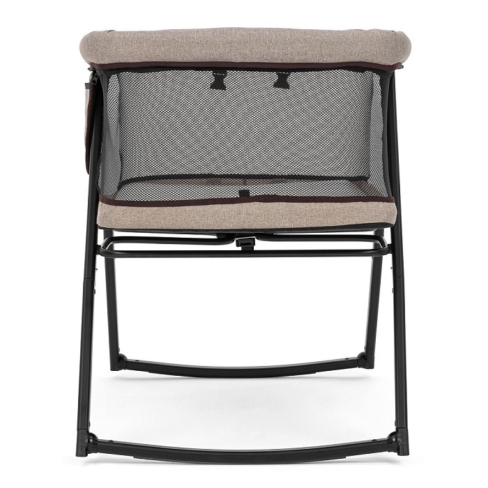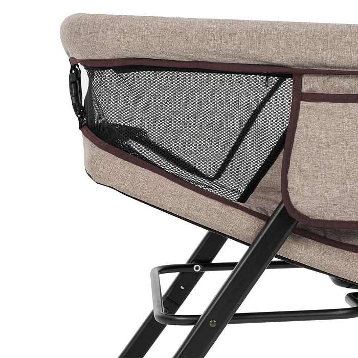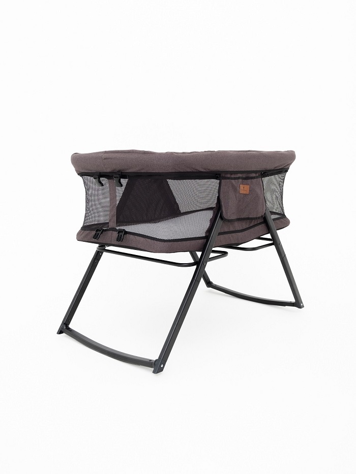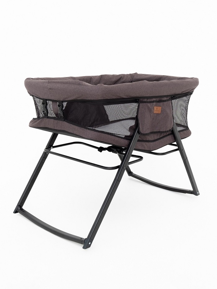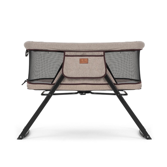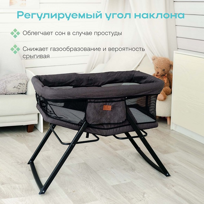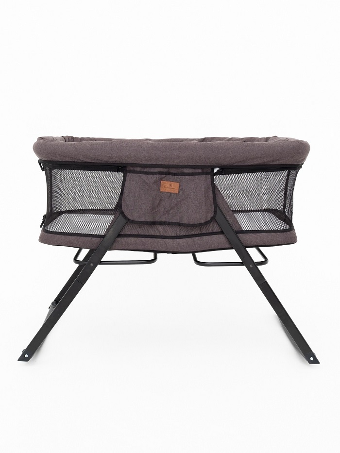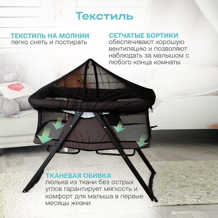 Колыбелька состоит из жесткого каркаса и качественной тканевой обивки. Практически все бортики кроватки выполнены из сетчатого материала, что способствует отличной вентиляции и хорошей видимости ребенка со всех сторон. Небольшой тканевый кармашек позволит держать рядом с малышом, что-то очень важное, например влажные салфетки, пустышку.