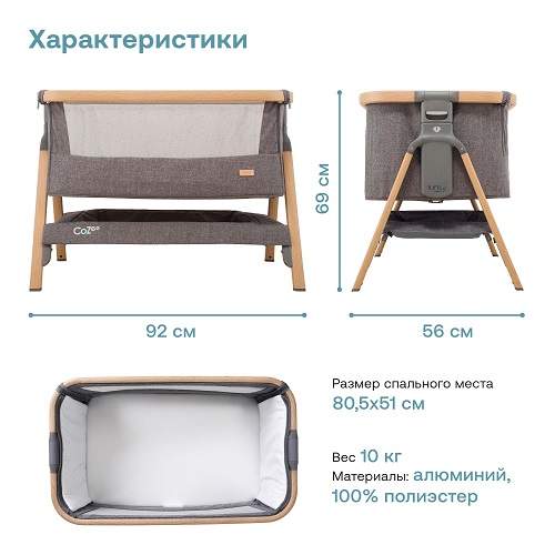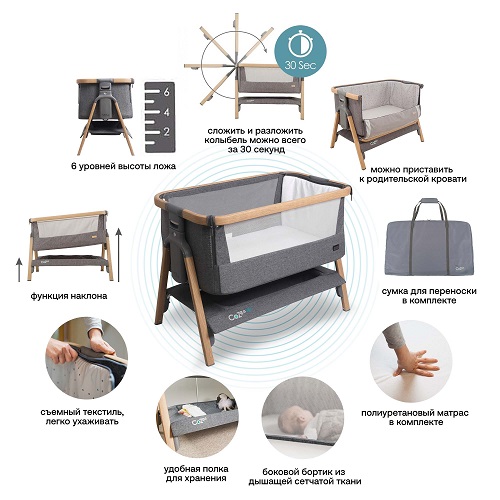 Кроватка идеальна для совместных поездок или путешествий. Колыбелька складывается и раскладывается за 30 секунд и помещается в сумку-переноску, которая идет в комплекте.