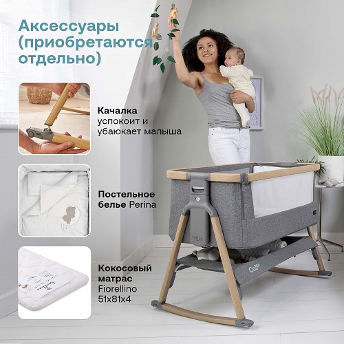 Предусмотрено использование колыбельки как прикроватной кровати. Для этого необходимо снять один бортик, отрегулировать высоту ложа и зафиксировать кроватку к взрослой кровати при помощи специальных ремней.