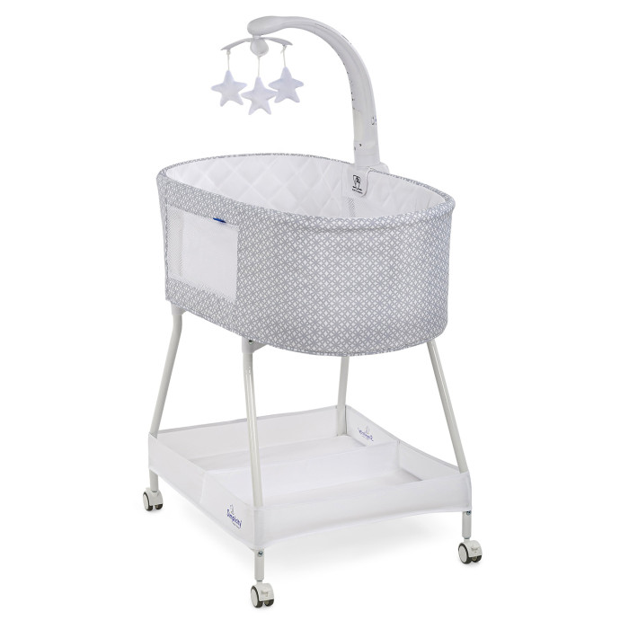 Благодаря колесикам колыбель можно легко передвигать в пределах квартиры. В неподвижном состоянии изделие фиксируется при помощи стопоров, предусмотренных на каждом из колес. Для хранения детских игрушек имеется вместительная тканевая корзина, которая крепится на опорных трубках.