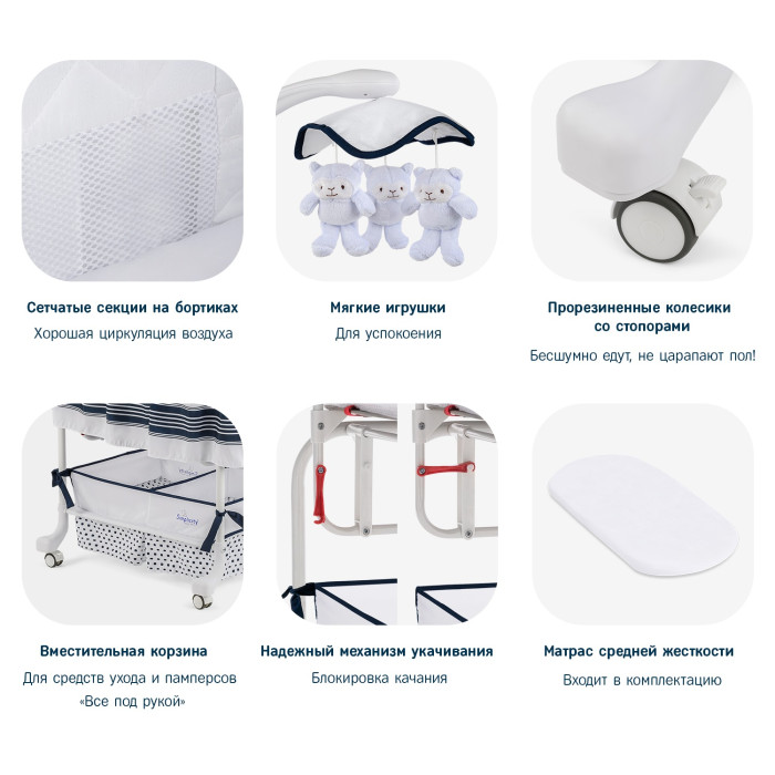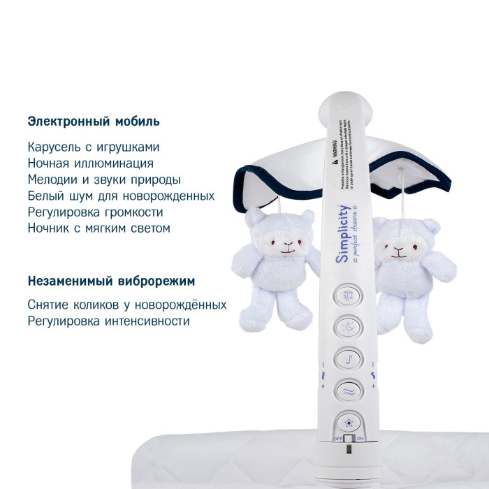 Помимо виброукачивания, мобиль обеспечивает управление проигрыванием музыкальных мелодий, заложенных в память устройства, вращение подвесной карусели с игрушками, а также запускает мерцающие огоньки и ночную подсветку. Предусмотрена регулировка громкости и синхронизация мерцания огоньков с играющей мелодией. Для того, чтобы ребенка было удобно укладывать в колыбель и извлекать из нее, мобиль можно отворачивать в сторону. Для защиты спящего малыша от яркого света предусмотрен складной капор. Под люлькой находится тканевая корзина для хранения постельного белья и других необходимых вещей. Благодаря наличию 4-х колес колыбель можно легко и быстро перемещать в пределах квартиры. Стопоры, предусмотренные на каждом колесе, при необходимости надежно фиксируют колыбель на месте. Основанием конструкции выступает трубчатая стальная рама, из которой выполнены опорные ножки, каркас люльки и капора. Все пластиковые элементы выполнены из ударопрочного материала. Текстильный чехол люльки, корзина для игрушек и капор изготовлены из плотной моющейся ткани.