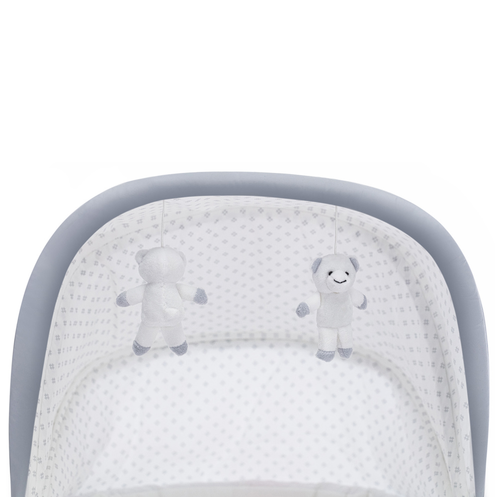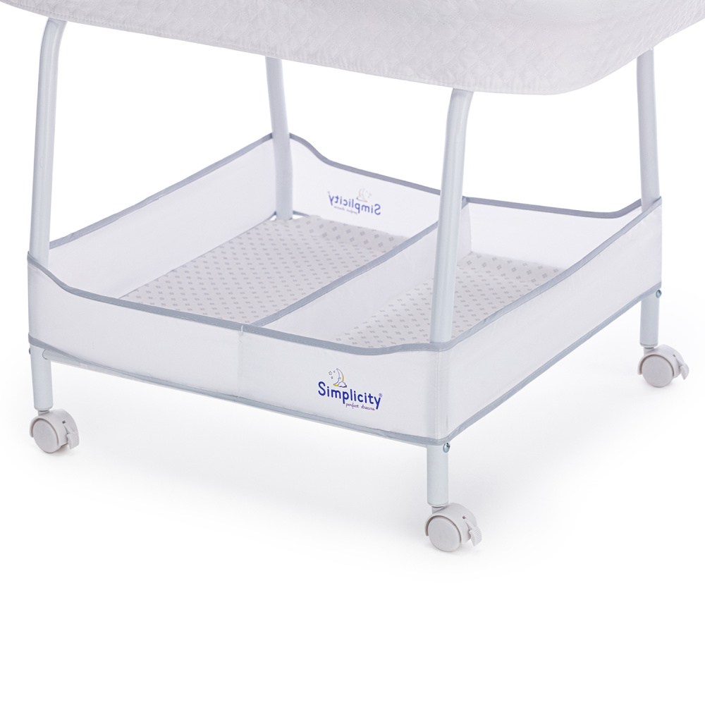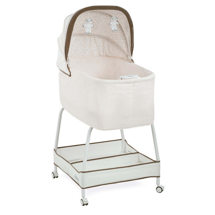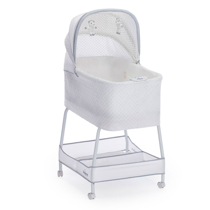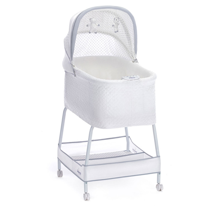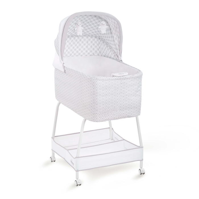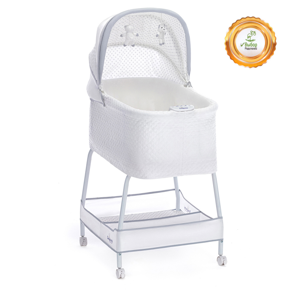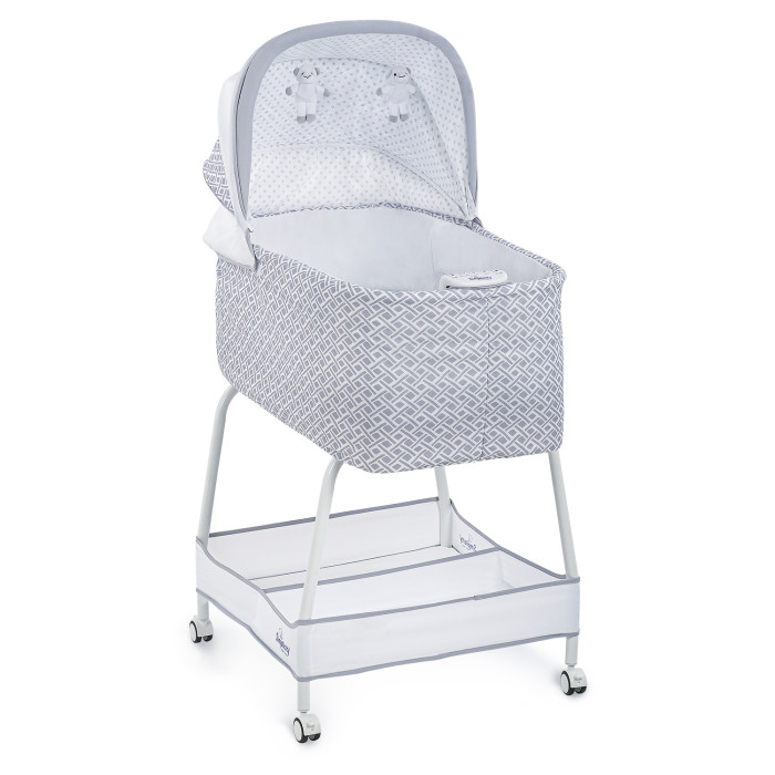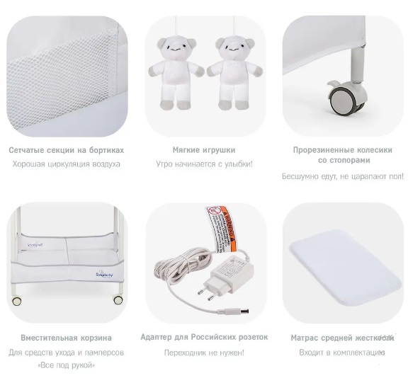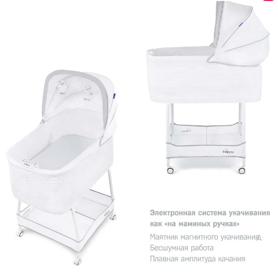 - В комплекте: колыбель, съёмный матрасик, наматрасник, капор, 2 игрушки, электронный модуль, электрошнур с адаптером (американская вилка), тканевая корзина для белья.
