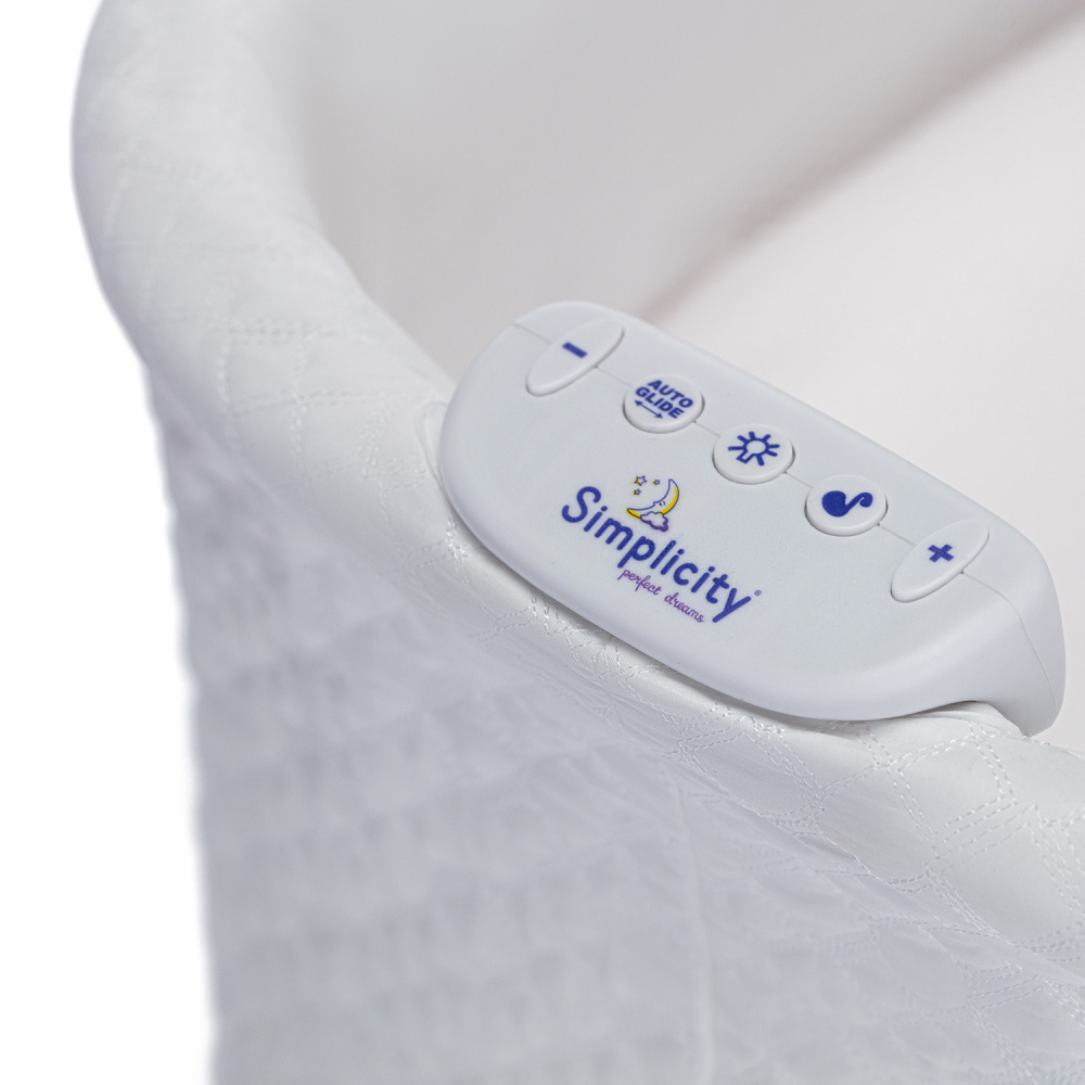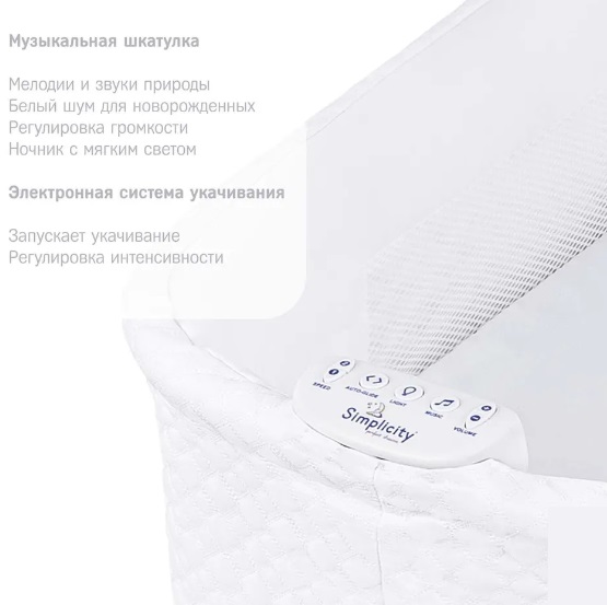 Главная особенность Simplicity Gl4010 Auto — это система автоматического плавного укачивания Auto Gliding, которая активируется при помощи кнопки на панели управления. Механизм работает практически бесшумно, устройство подключается к электросети и не требует установки батареек. Панель управления совмещена со светозвуковым модулем, который воспроизводит успокаивающую музыку и может служить ночником.