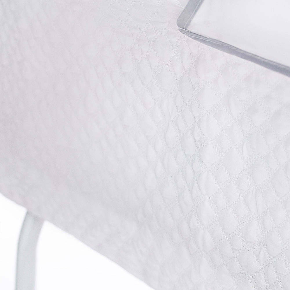 Тканевые элементы капора, корзины и люльки выполнены из плотного качественного текстиля, дно сделано из ударопрочного пластика. Опорные ножки и каркас колыбели изготовлены из прочного алюминиевого профиля. Небольшой вес рамы и наличие колес облегчает перемещение из комнаты в комнату. Для того, чтобы зафиксировать колыбель на одном месте, предусмотрены блокираторы колес.