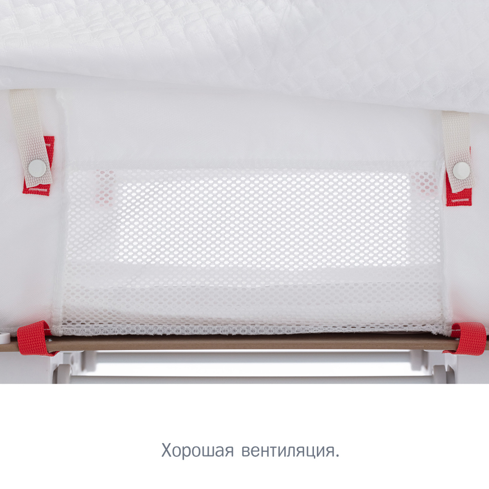 Внутри люльки находится плотный матрасик, в комплекте к которому предлагается простынка на резинке. Удобный складной капор колыбели позволяет укрыть малыша от прямого света, мягкие подвесные игрушки на его дуге способствуют развитию зрительного восприятия и развлекают ребенка. Внизу находится вместительная корзина для хранения игрушек и средств по уходу.