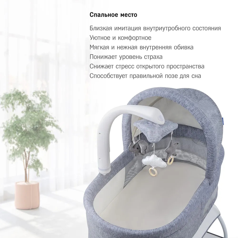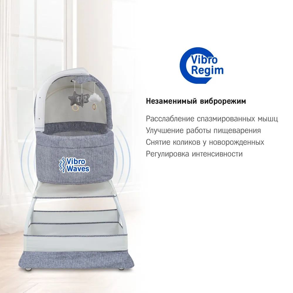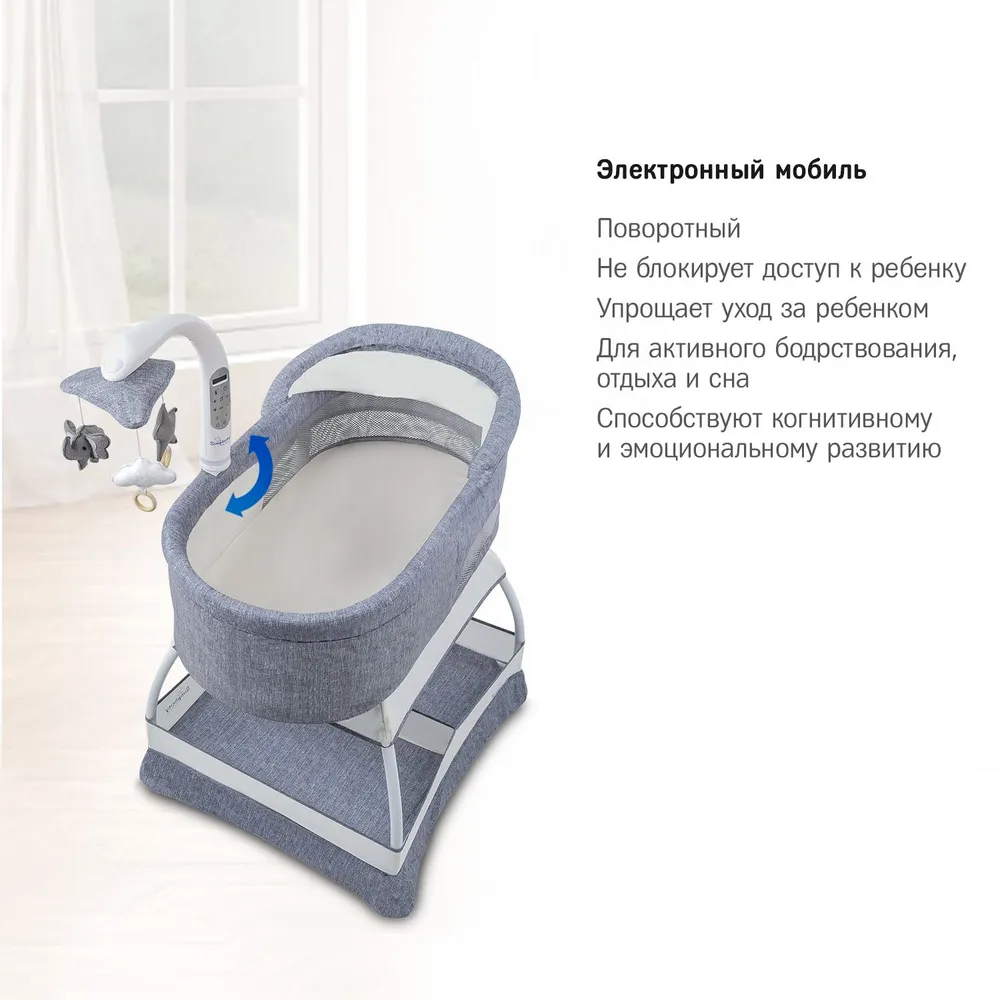 Люлька колыбель оснащена электронным мобилем, который запускает вращение карусели с подвесными игрушками, включает виброрежим, ночник и проигрывает релаксирующие мелодии, изменяет интенсивность виброрежима и регулирует громкость мелодий через простое нажатие на кнопки мобиля.