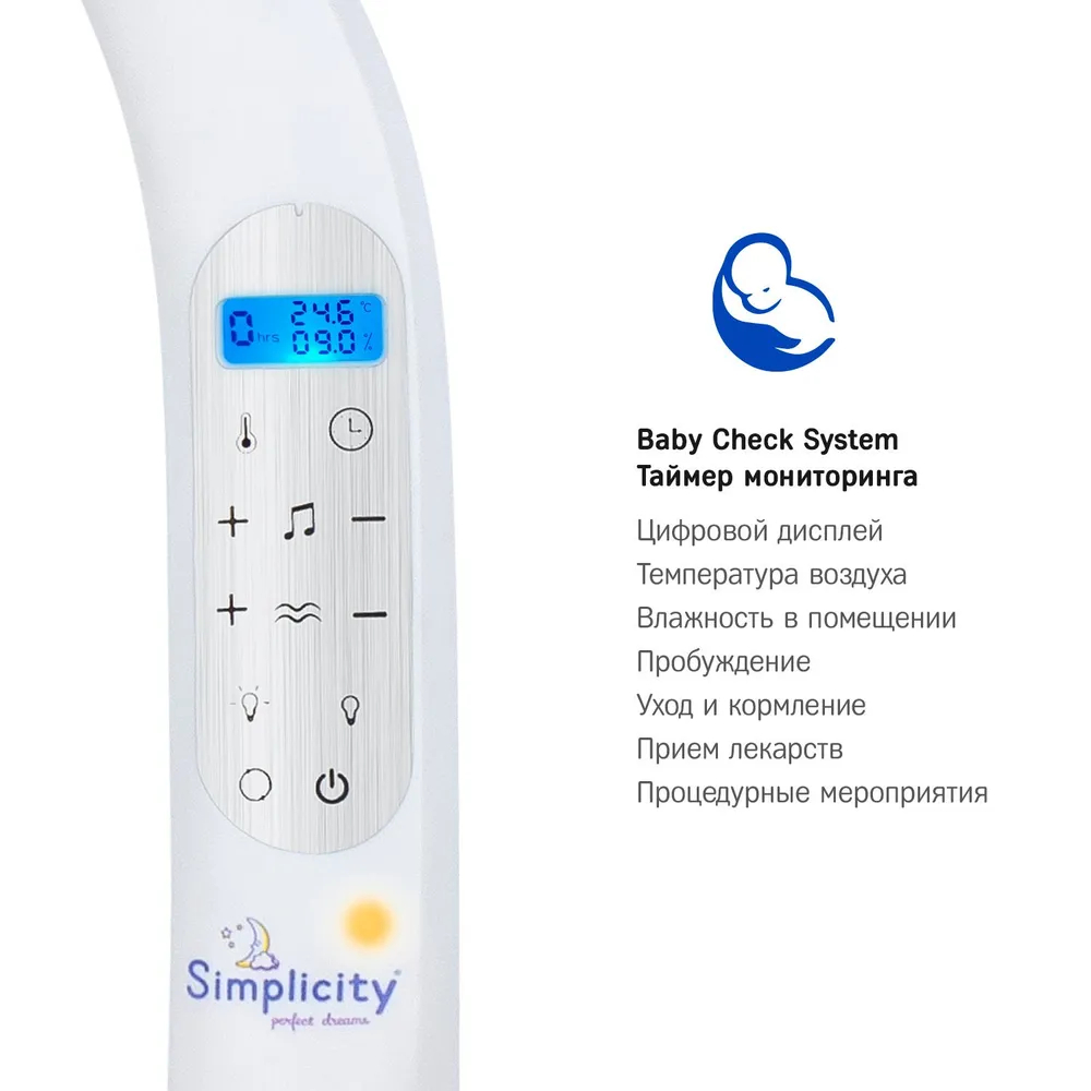 Таймер мониторинга (интеллектуальная система Baby Check System) подскажет данные о температуре и влажности воздуха, подаст сигнал напоминания для мамы, что настало время просыпаться, покормить ребёнка, принять лекарства или приступить к процедурным мероприятиям.