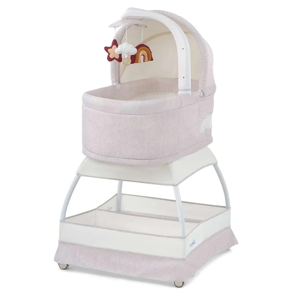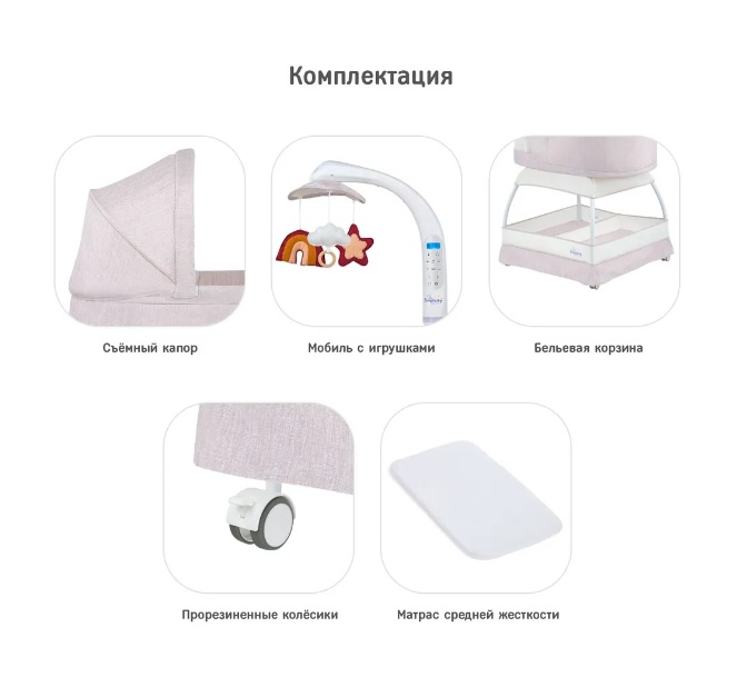 В комплекте: колыбель, съёмный матрасик, наматрасник, капор, мобиль с тремя игрушками, тканевая корзина для белья.