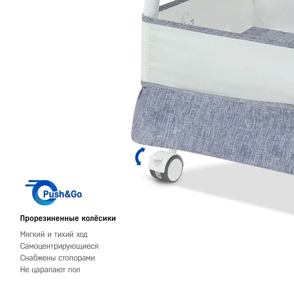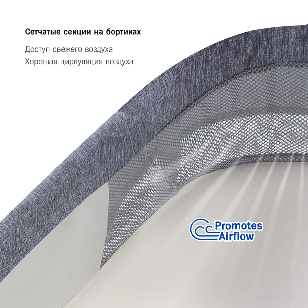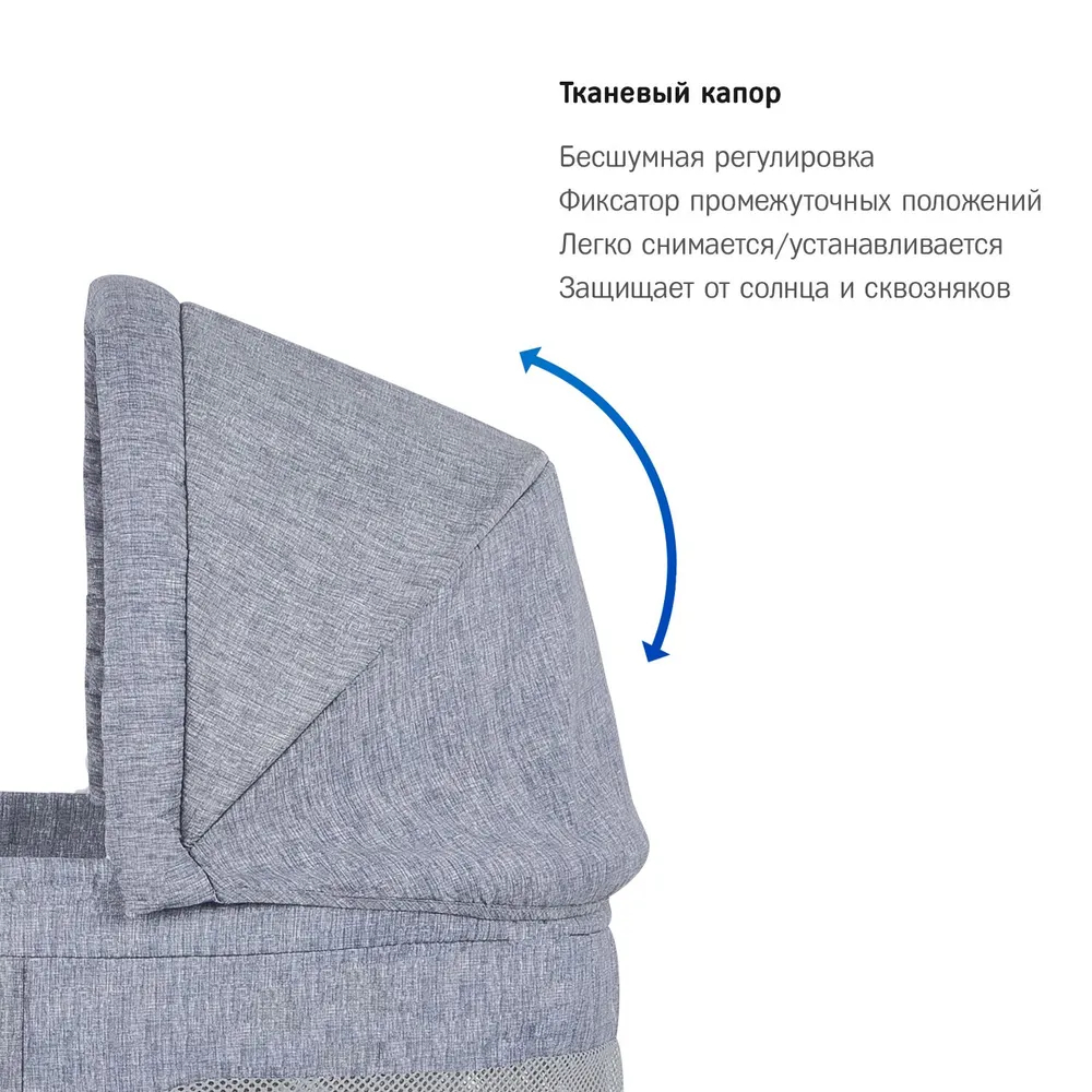 Чехол колыбели выполнен из инновационной ткани «Micro-Mesh 360», которая отвечает современным требованиям безопасности и позволяет создавать собственный микроклимат внутри колыбели, что помогает значительно снизить риск СВДС. Внутреннее пространство хорошо проветривается благодаря сетчатым вставкам в изголовье колыбели. В такую колыбель всегда будет доступ свежего воздуха и ребенок не будет перегреваться. За основу дизайна колыбели был взят полюбившийся покупателям современный стиль контемпорари.