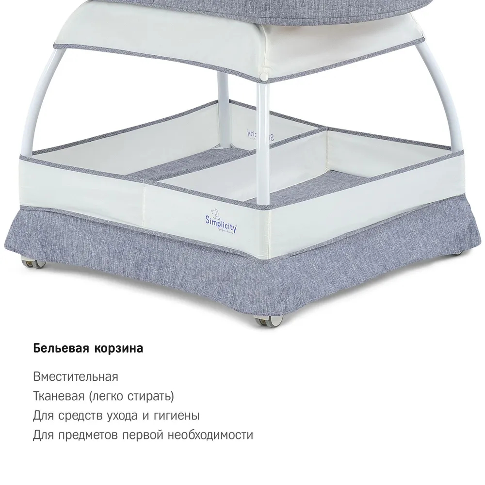 Большой удобный капор скрывает малыша от солнца, а прорезиненные колёсики позволяют бесшумно передвигать колыбель в пределах квартиры. Вместительная бельевая корзина разделена на два отсека, благодаря чему все нужное для ухода за ребенком всегда будет под рукой.