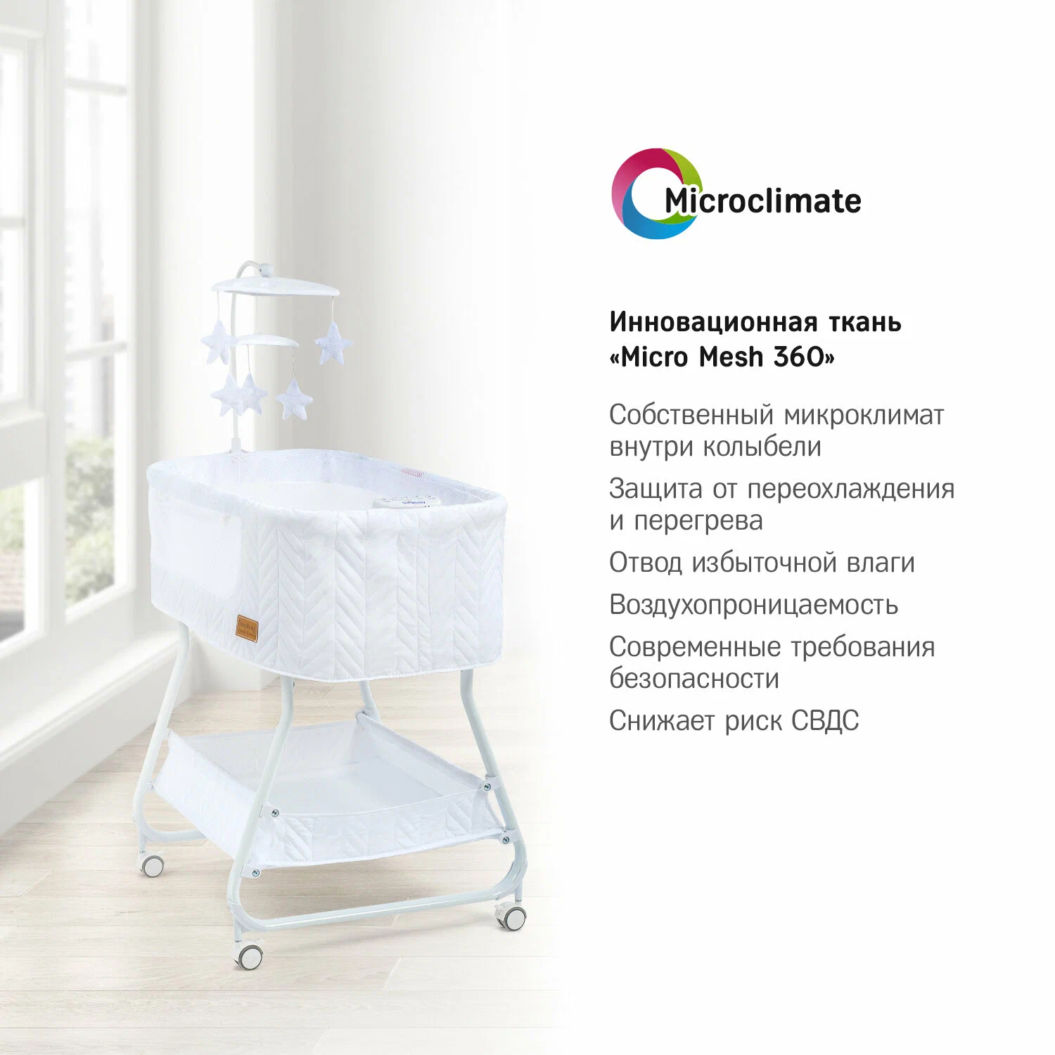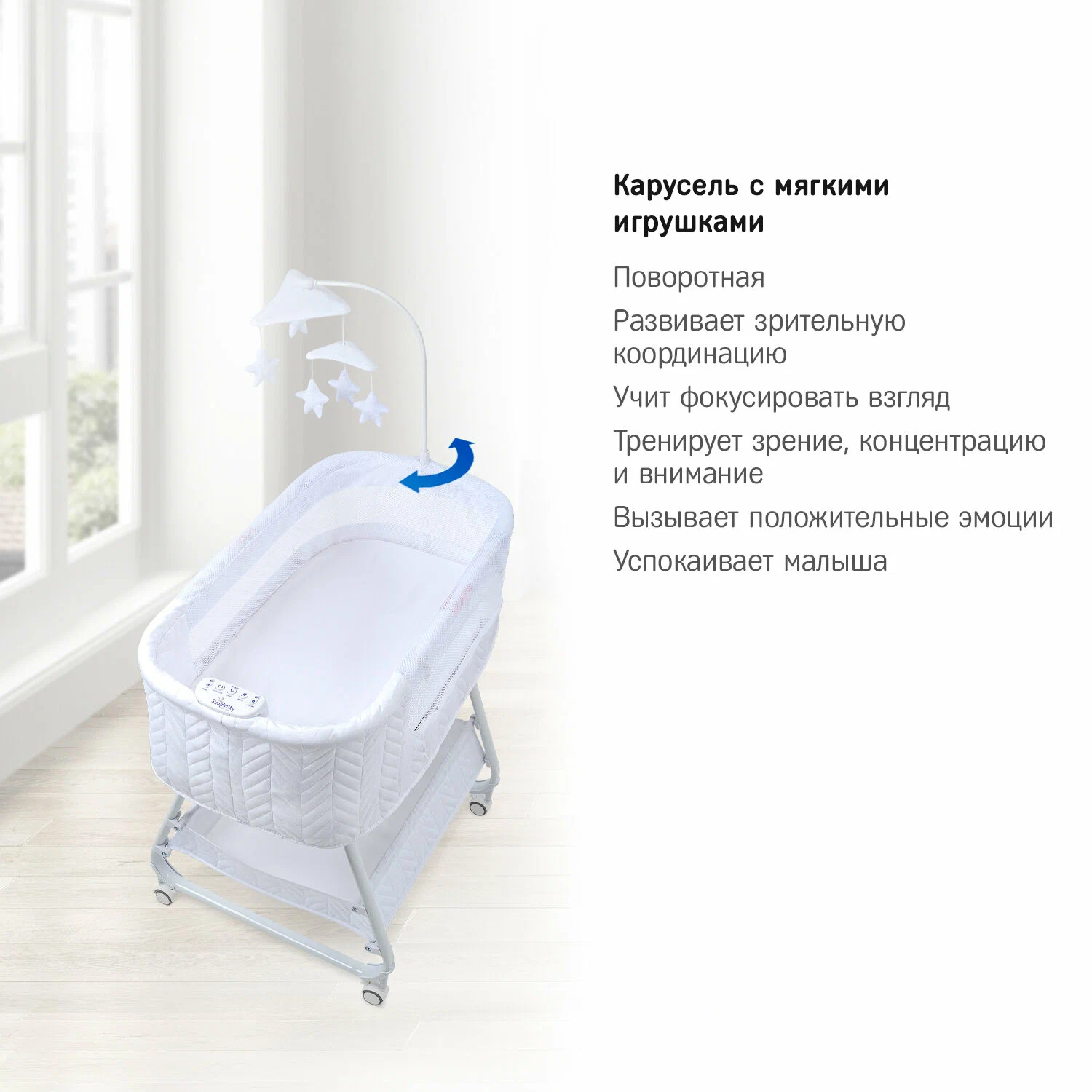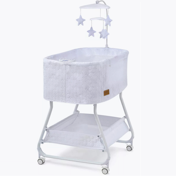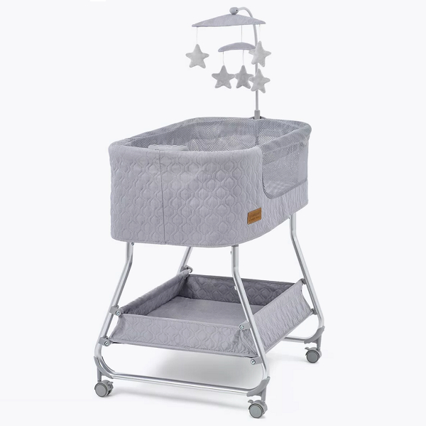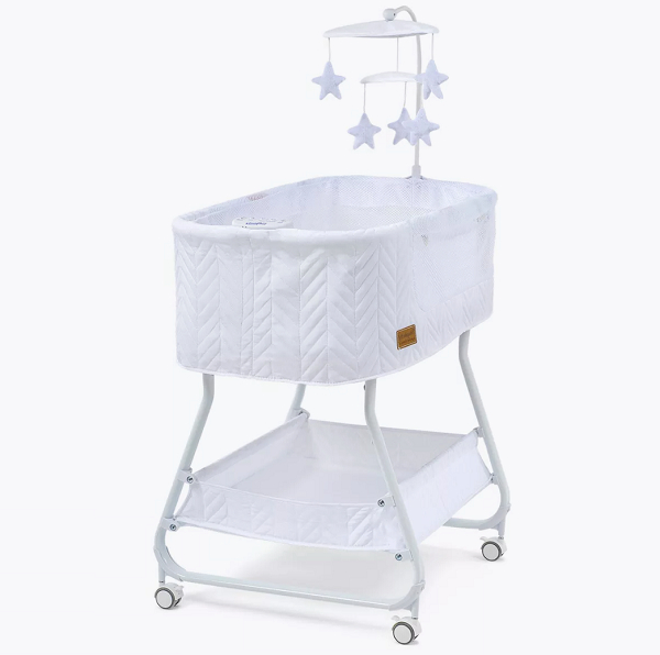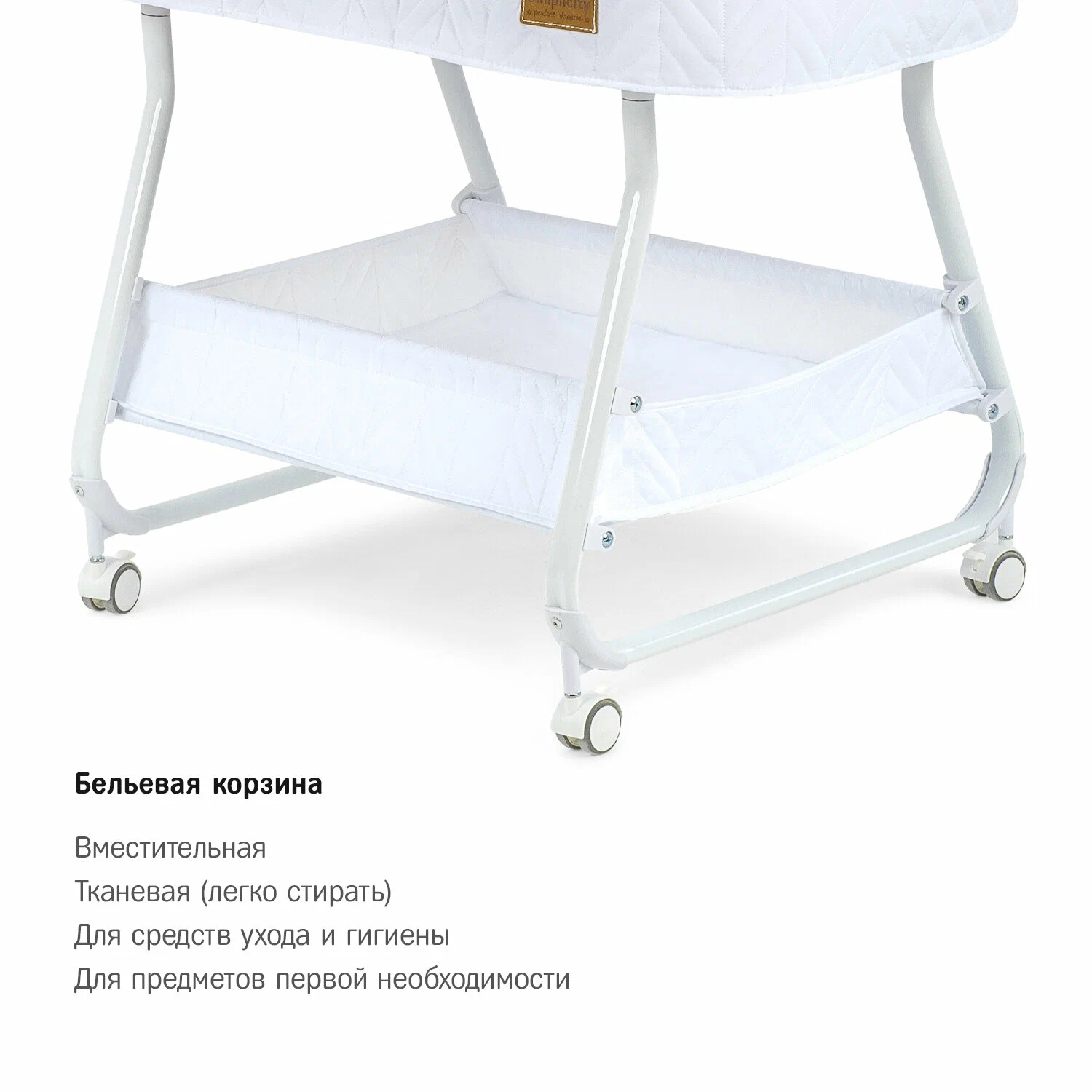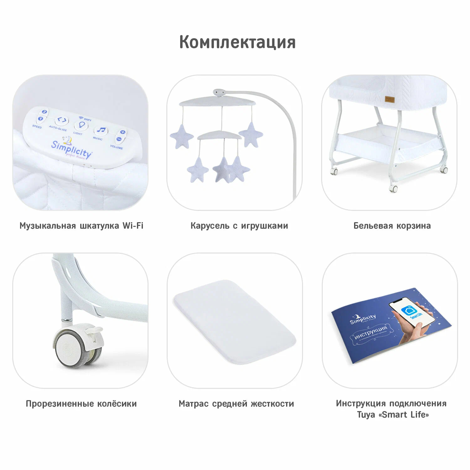 Колыбель, съёмный матрасик, наматрасник, музыкальная шкатулка, карусель с игрушками, электрошнур с адаптером, тканевая корзина для белья.