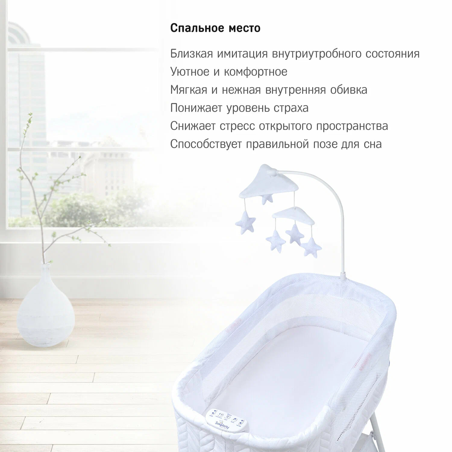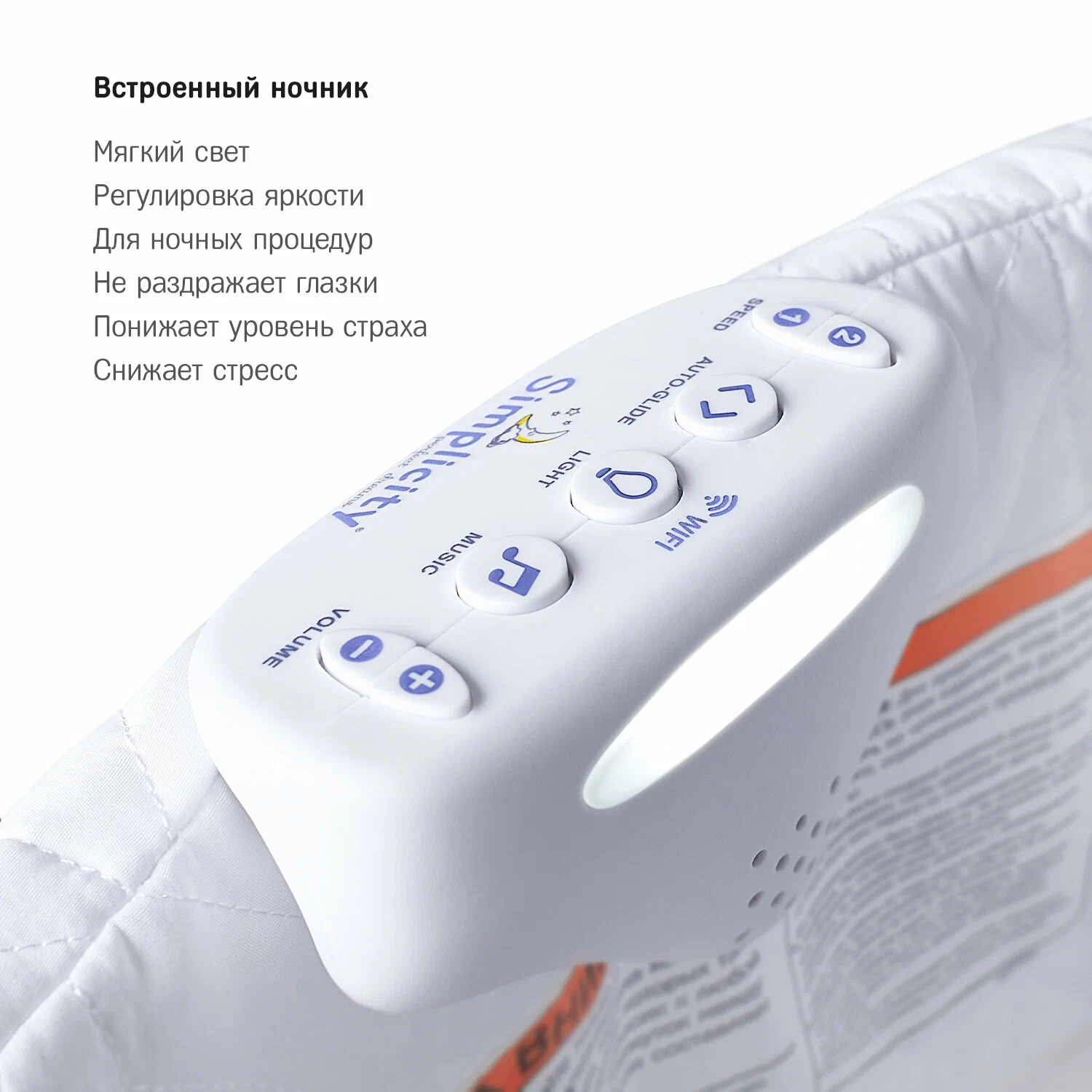 - Функции: ночник, музыка, изменение громкости, электронное укачивание