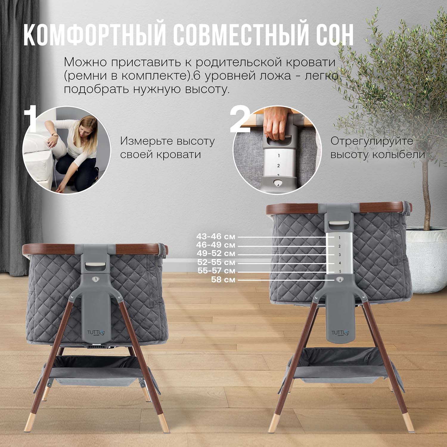 - высота ложа регулируется в 6 положениях, что позволяет приставлять колыбель практически к любой кровати (максимальная высота матраса – 58 см)