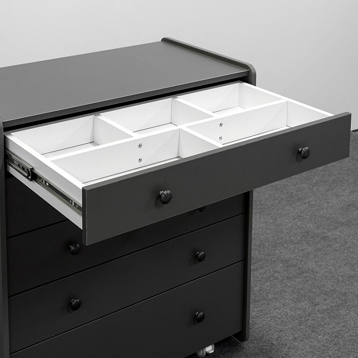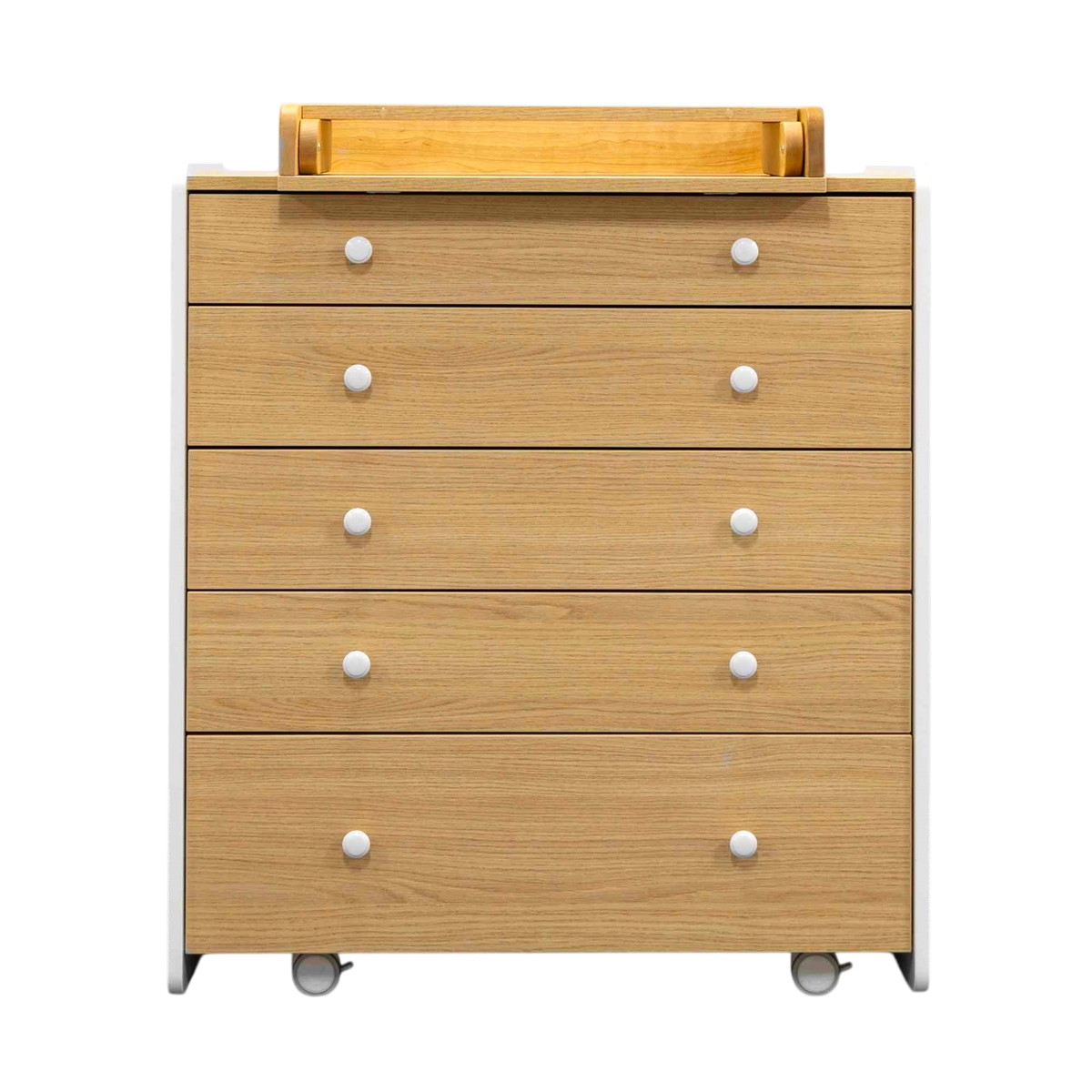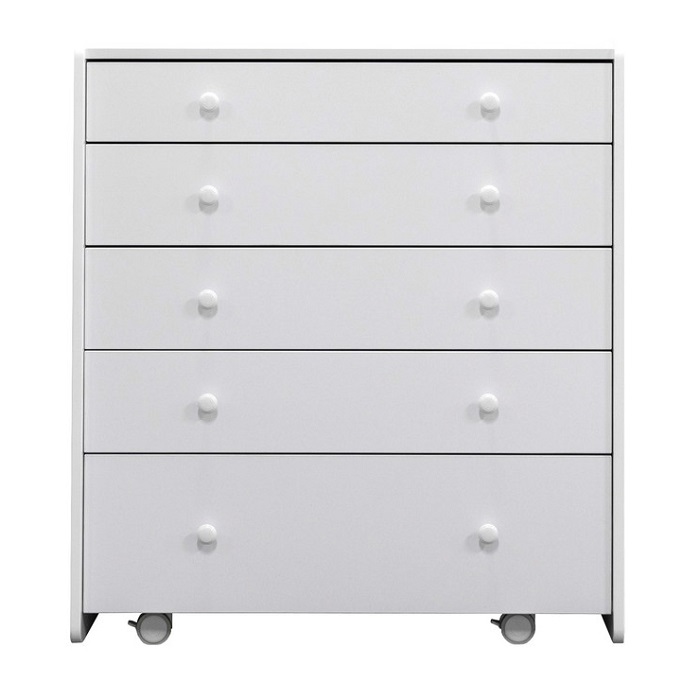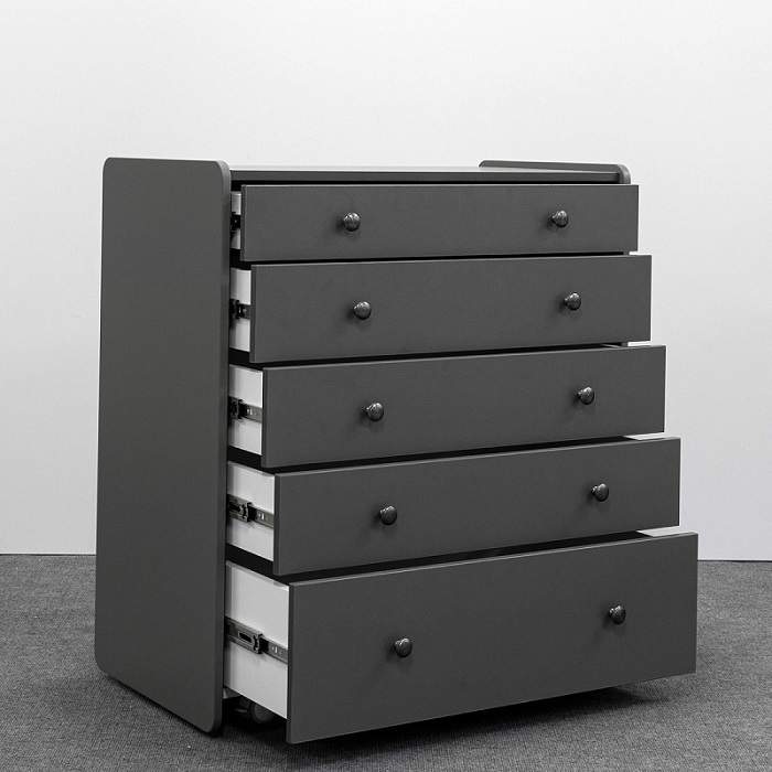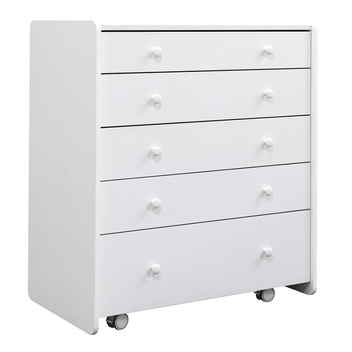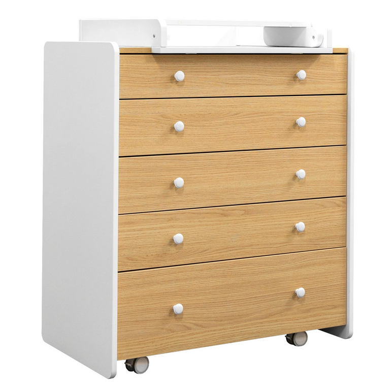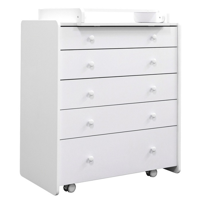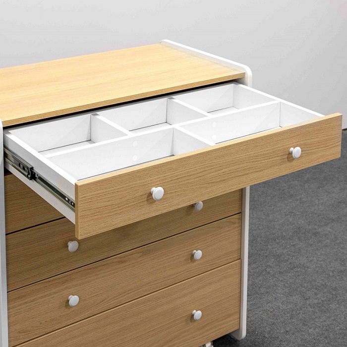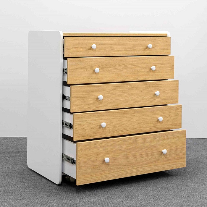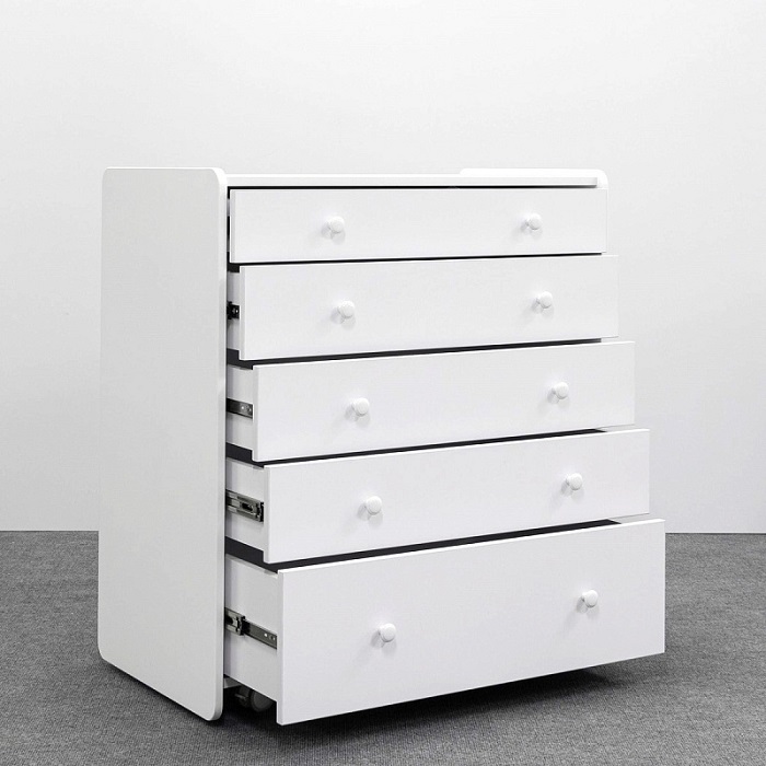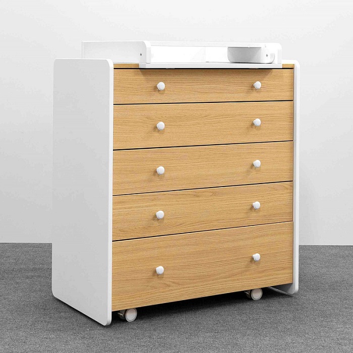 Комод Антеми Мари оснащен 5 вместительными ящиками. Каждый ящик оснащен направляющими для тихого хода и полного выдвижения. Верхний ящик поделен на секции, что позволит более удобно разместить маленькие вещи для ребенка и легче поддерживать порядок в полке.