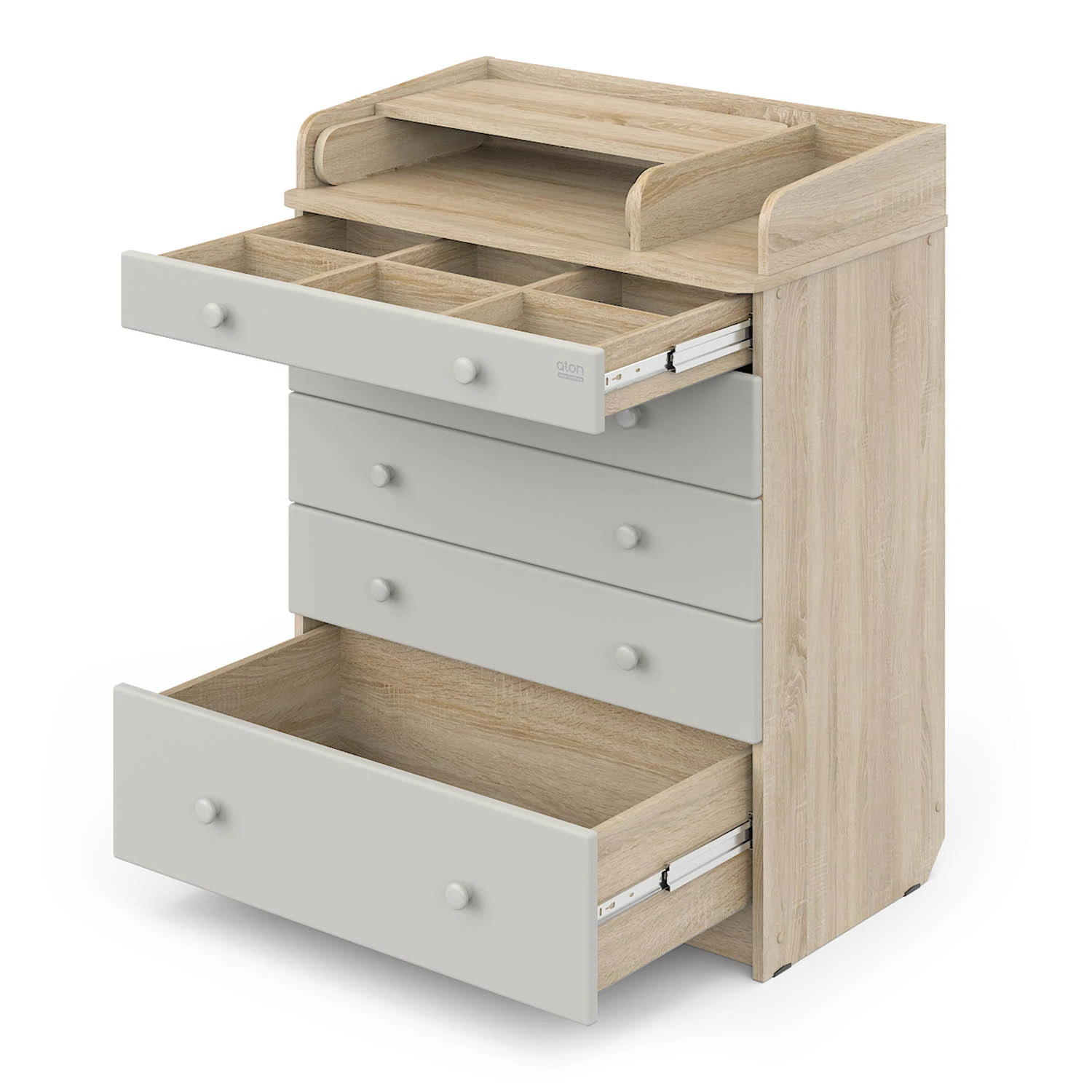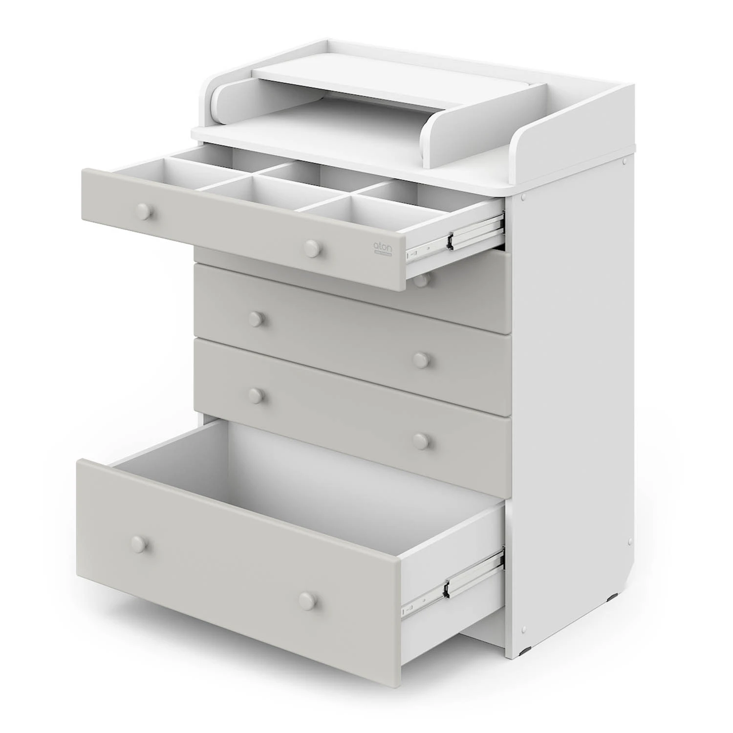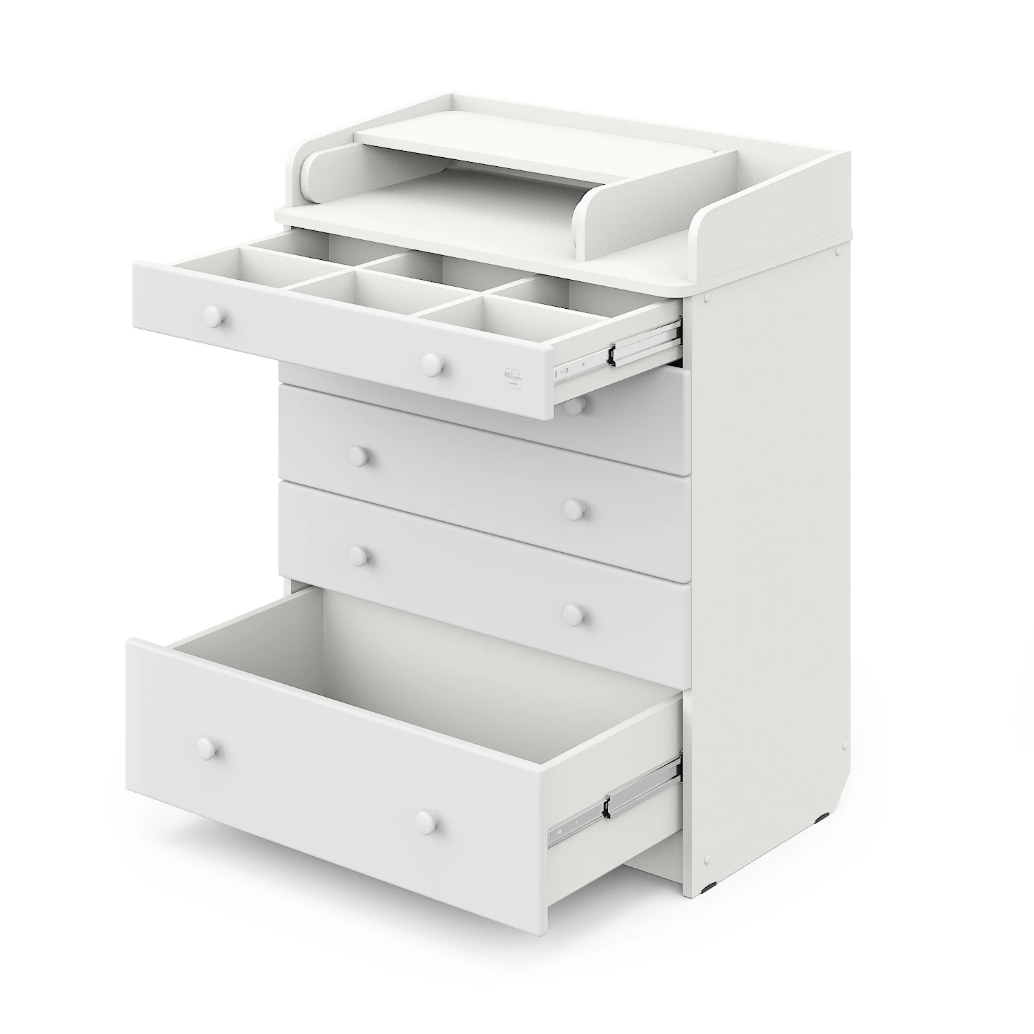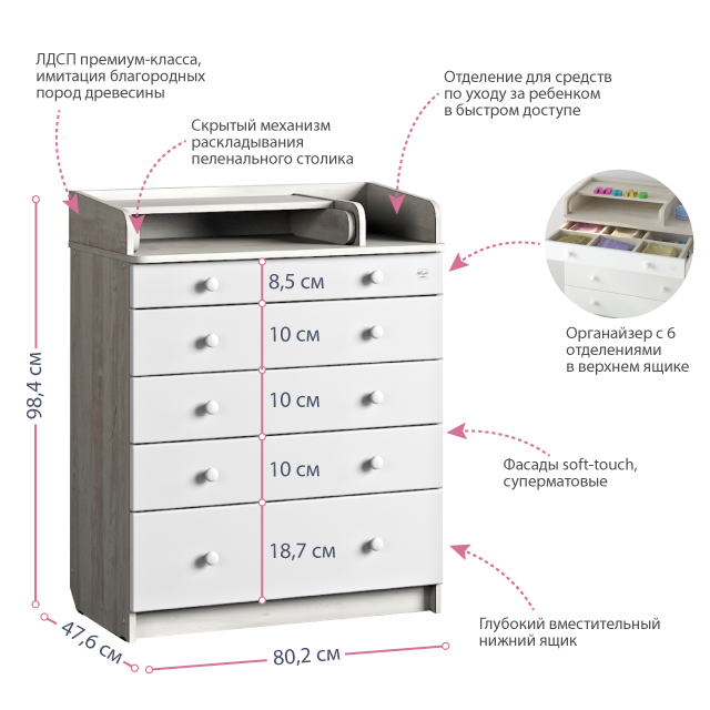 Комод очень вместительный благодаря пяти ящикам, которые установлены на надежные шариковые направляющие бесшумного хода. Нижний ящик большей глубины, а верхний с органайзером для удобства сортировки детских вещей (6 отделений). Глубина ящиков сверху вниз: 8,5 см, 10 см, 10 см, 10 см, 18,7 см.