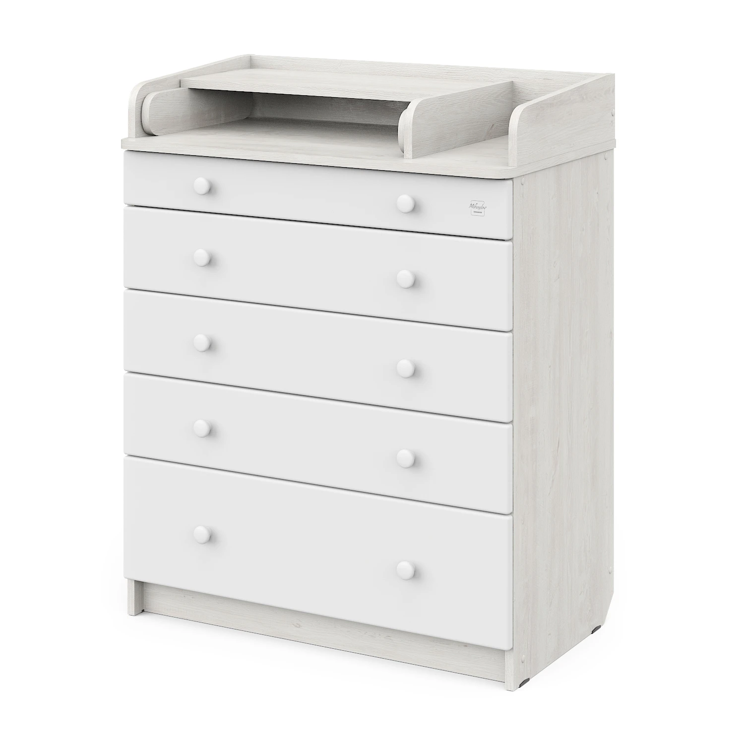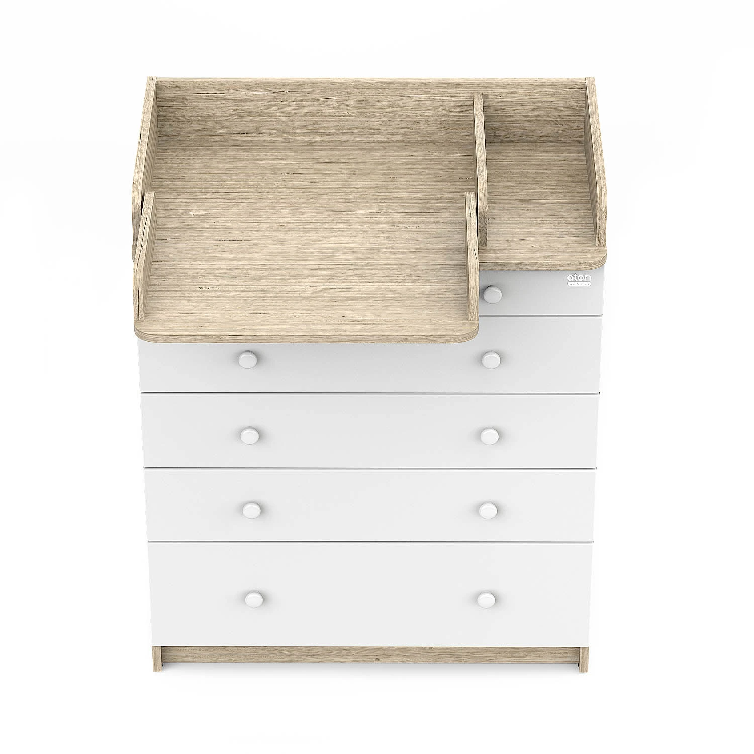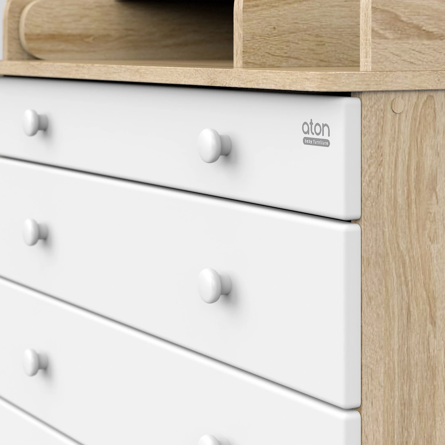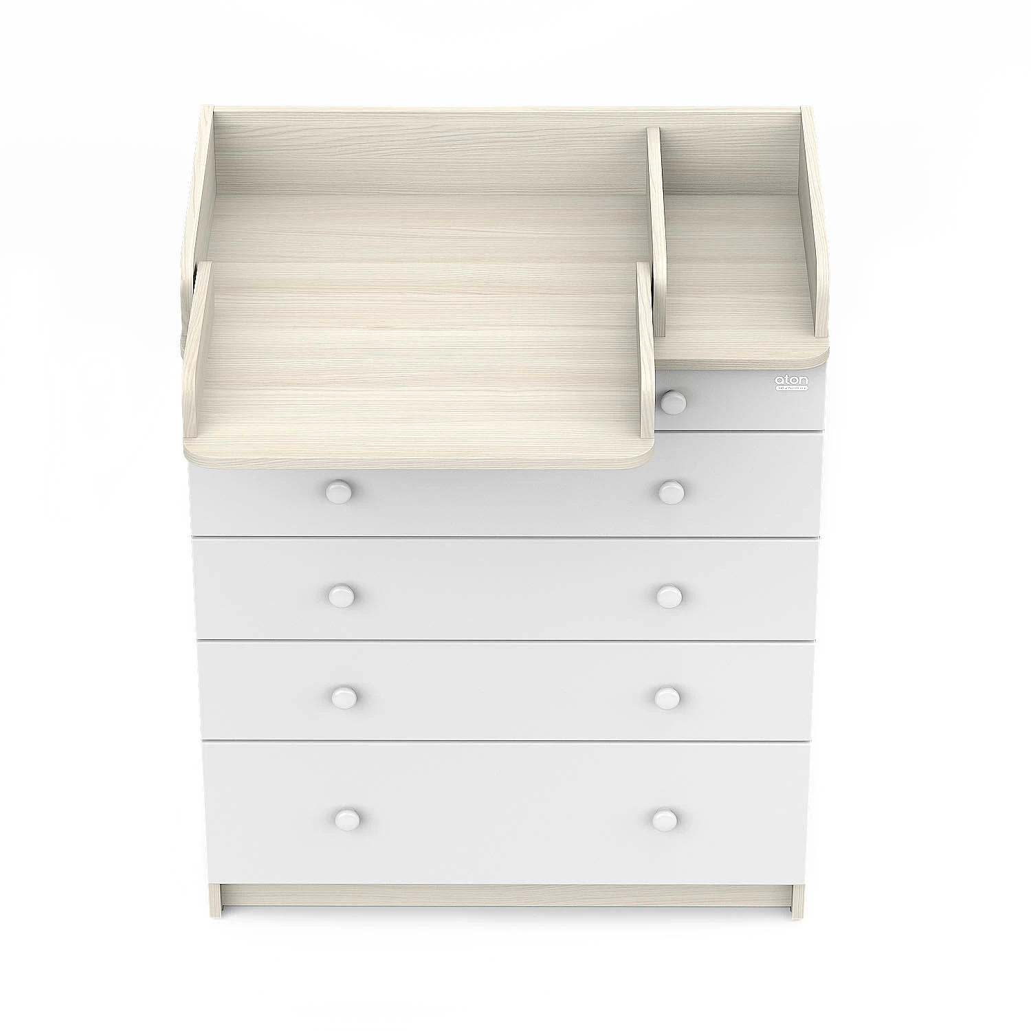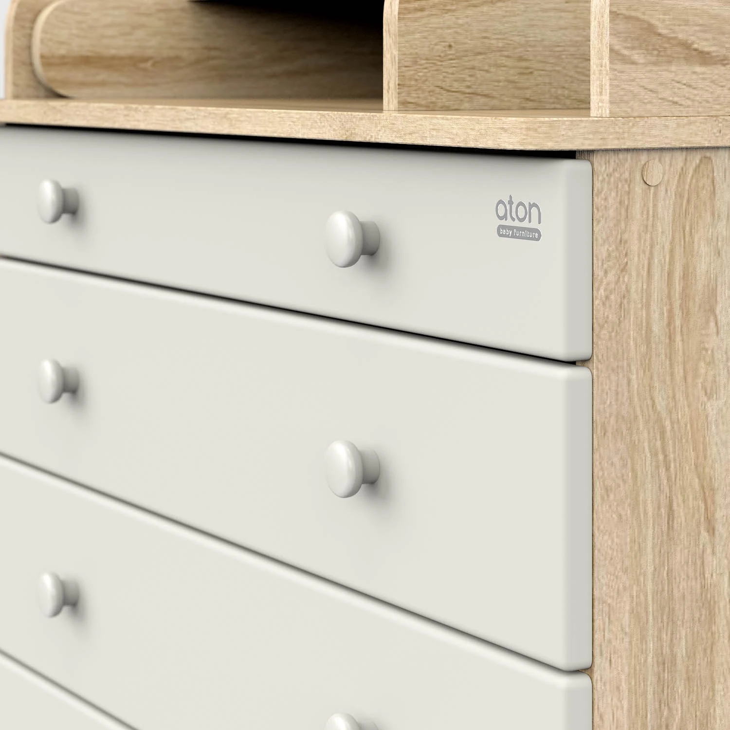Комод Атон MAKS ЛДСП 800/5 (Атон Макс) - элегантный, выполненный в современном стиле и удобный пеленальный комод, в комбинациях контрастных оттенков благородной древесины с нежными, приятными на ощупь, белыми или бежевыми фасадами из МДФ с шариковыми направляющими.