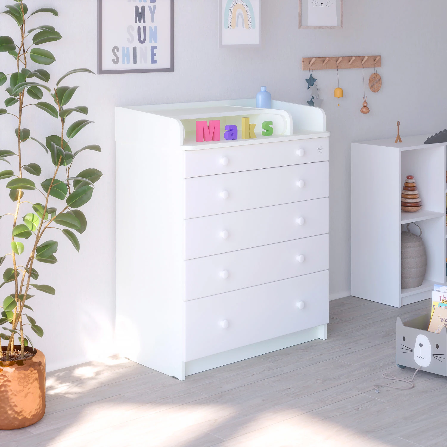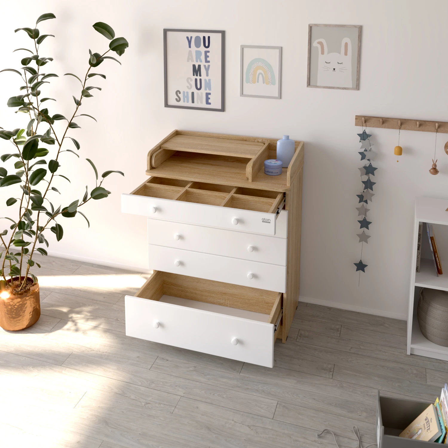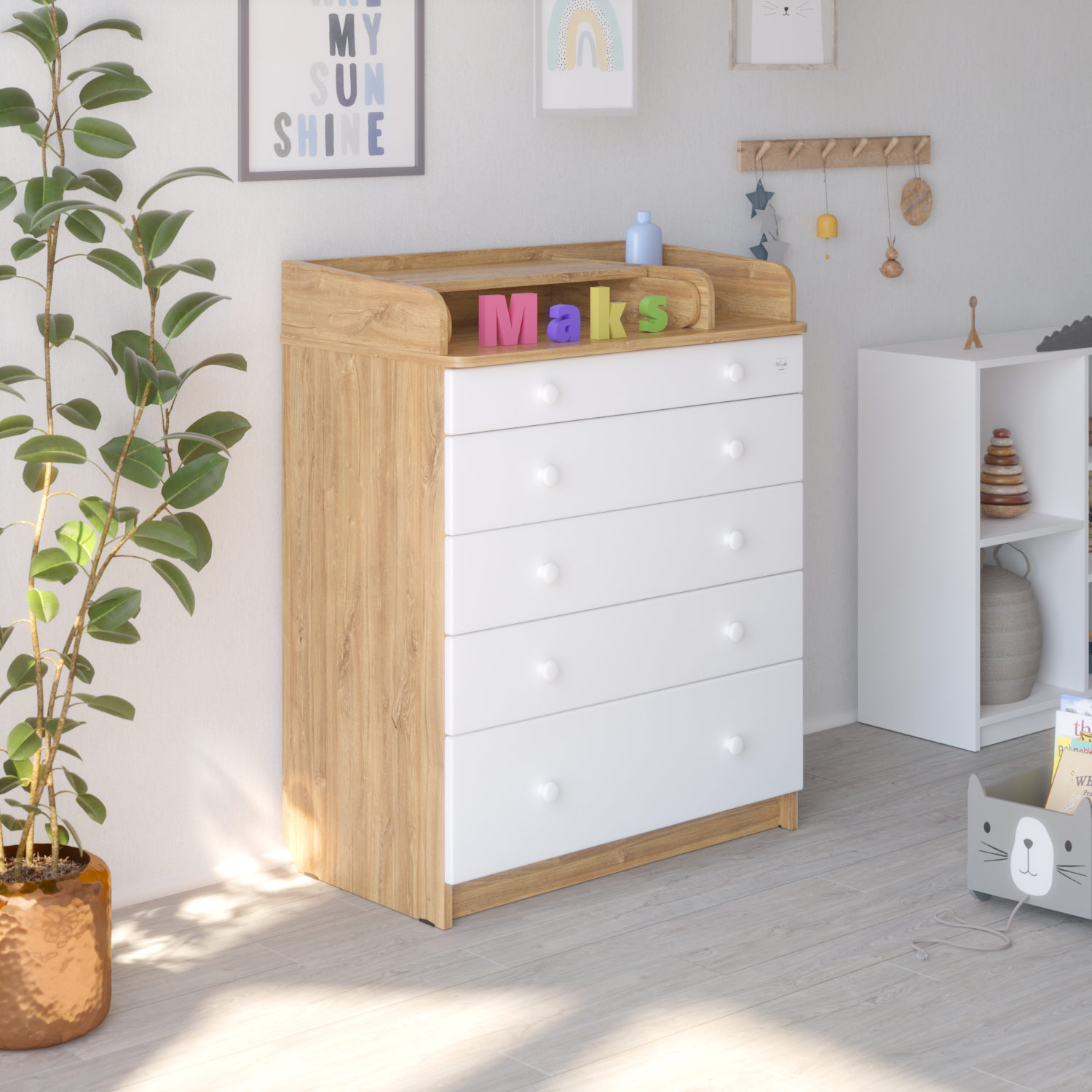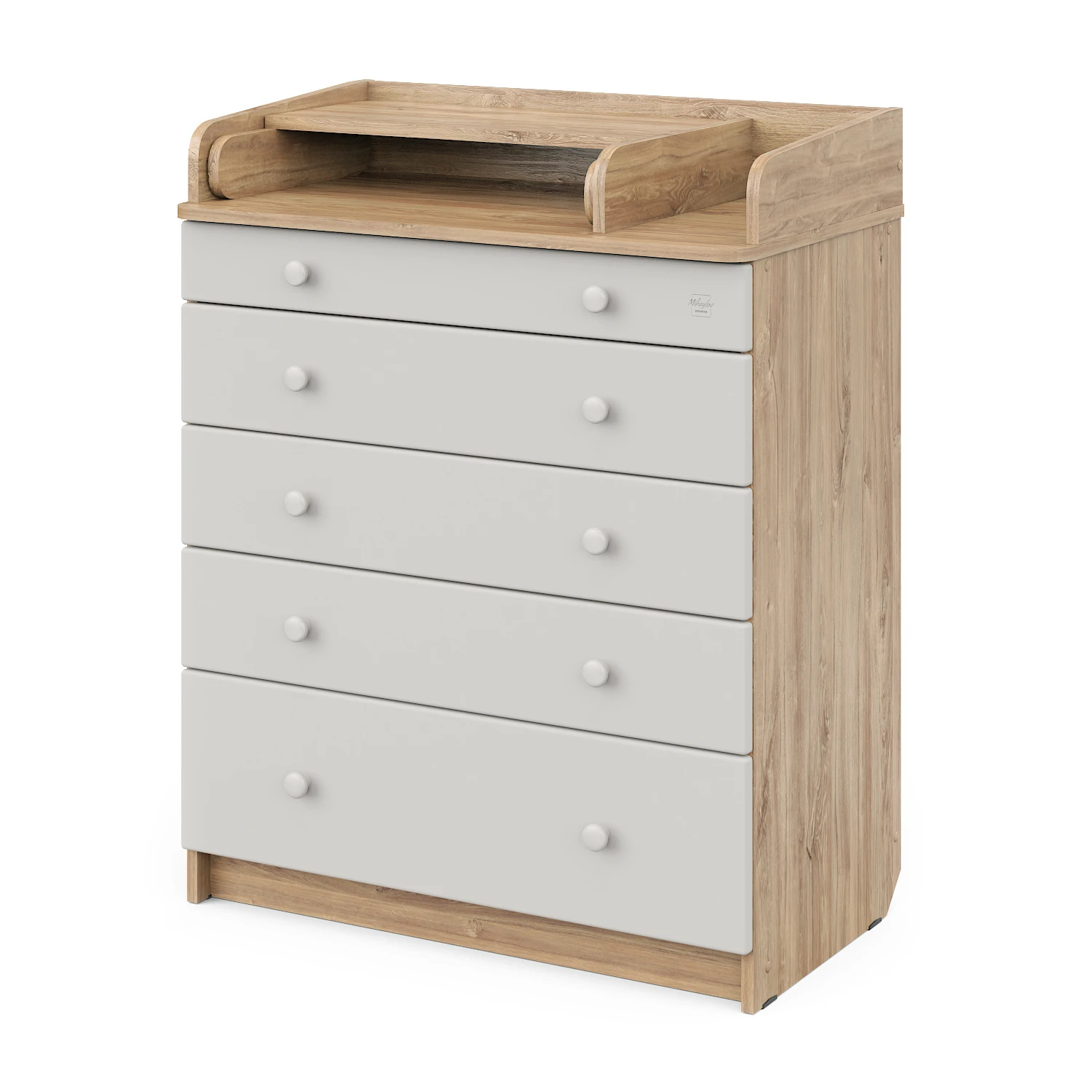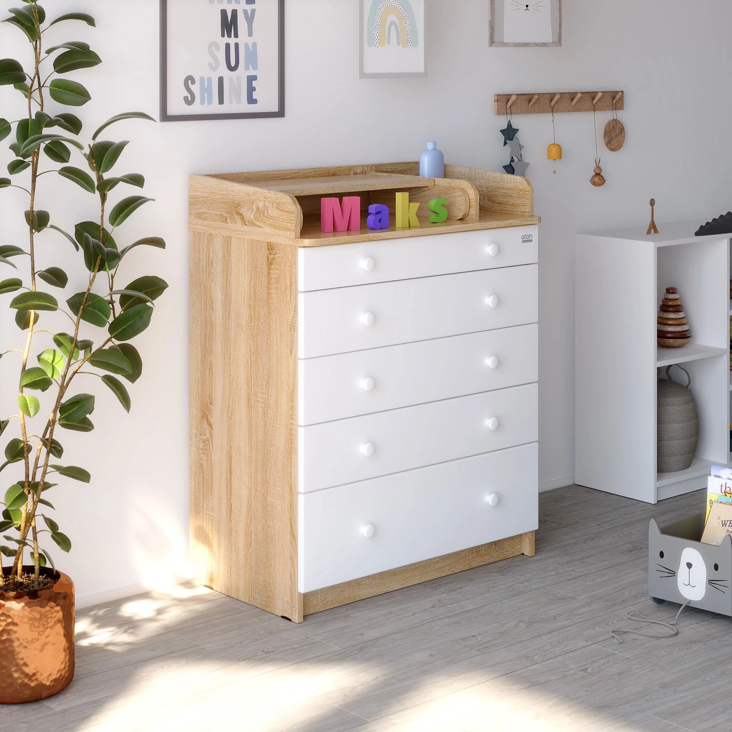 Комод Атон MAKS ЛДСП 800/5 (Атон Макс) - элегантный, выполненный в современном стиле и удобный пеленальный комод, в комбинациях контрастных оттенков благородной древесины с нежными, приятными на ощупь, белыми или бежевыми фасадами из МДФ с шариковыми направляющими.