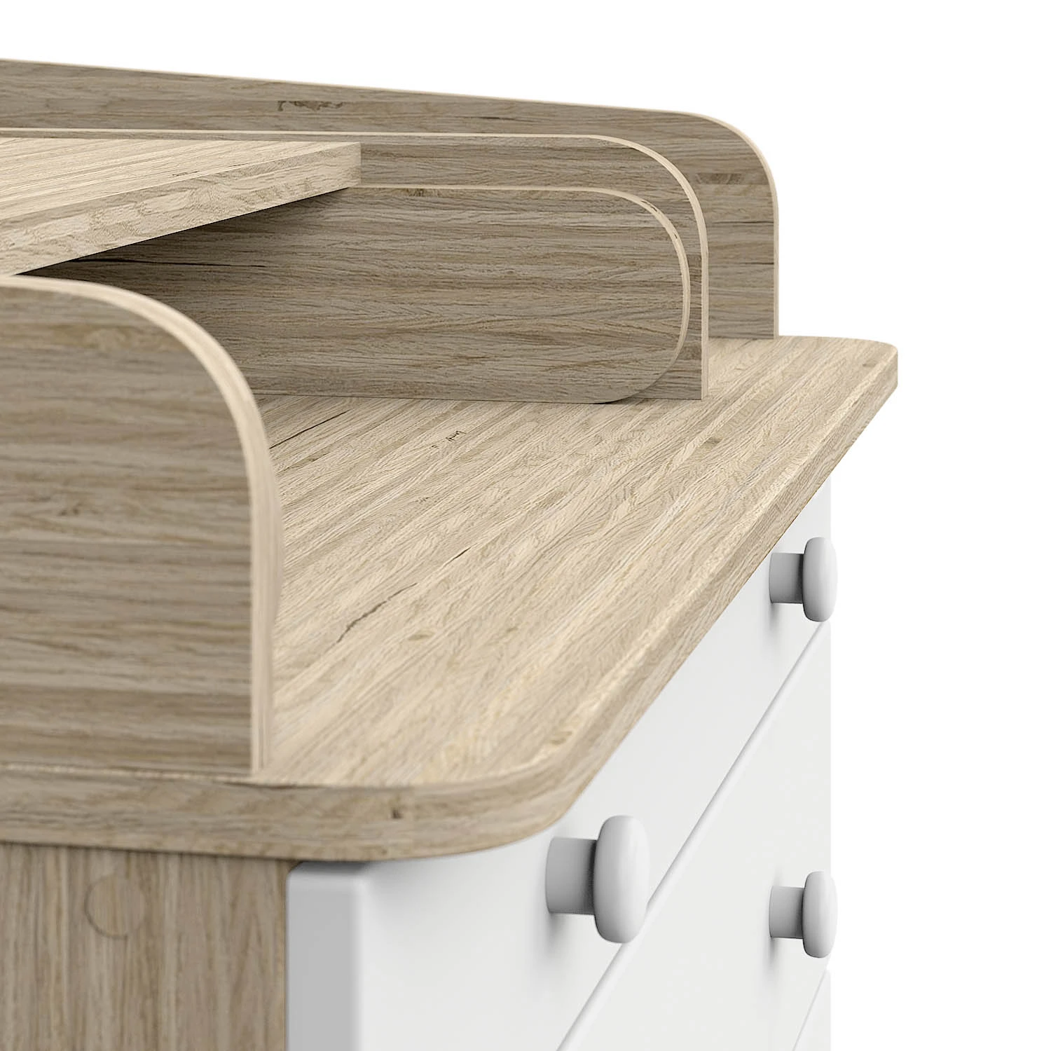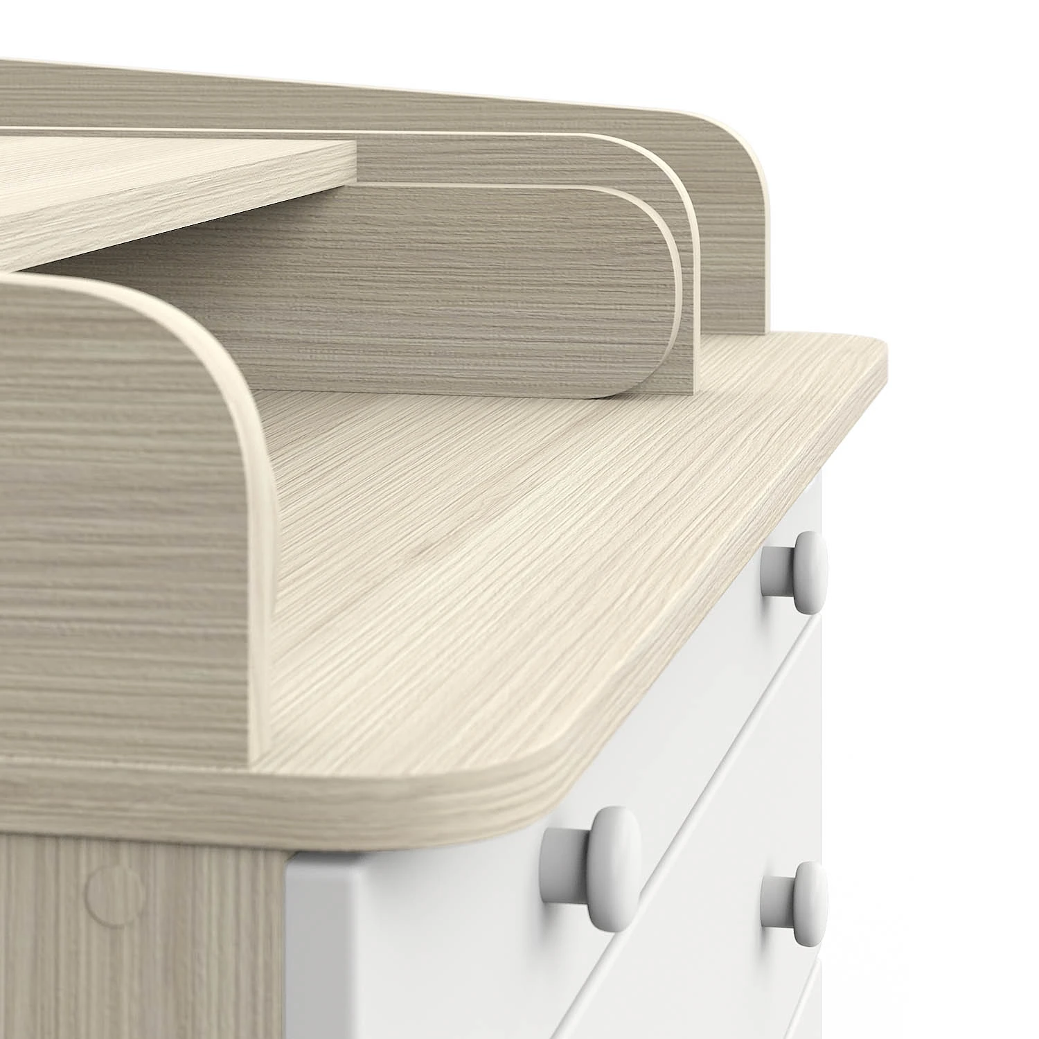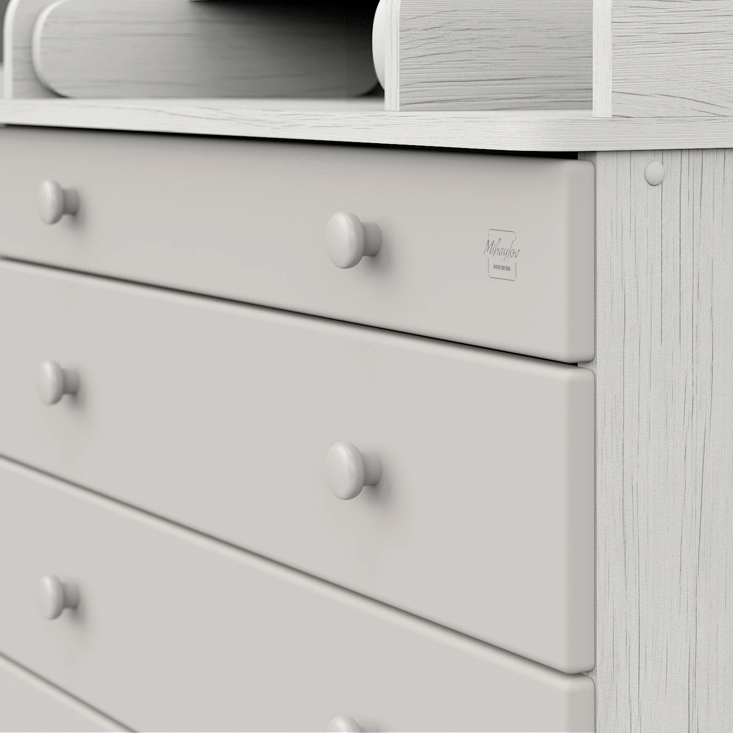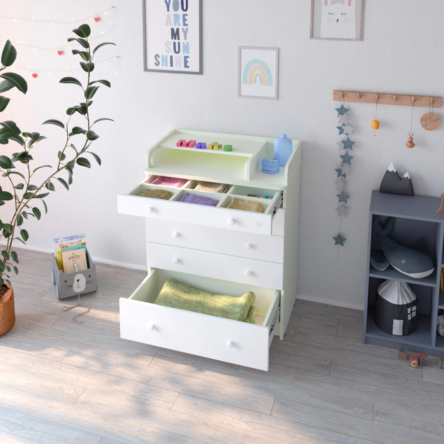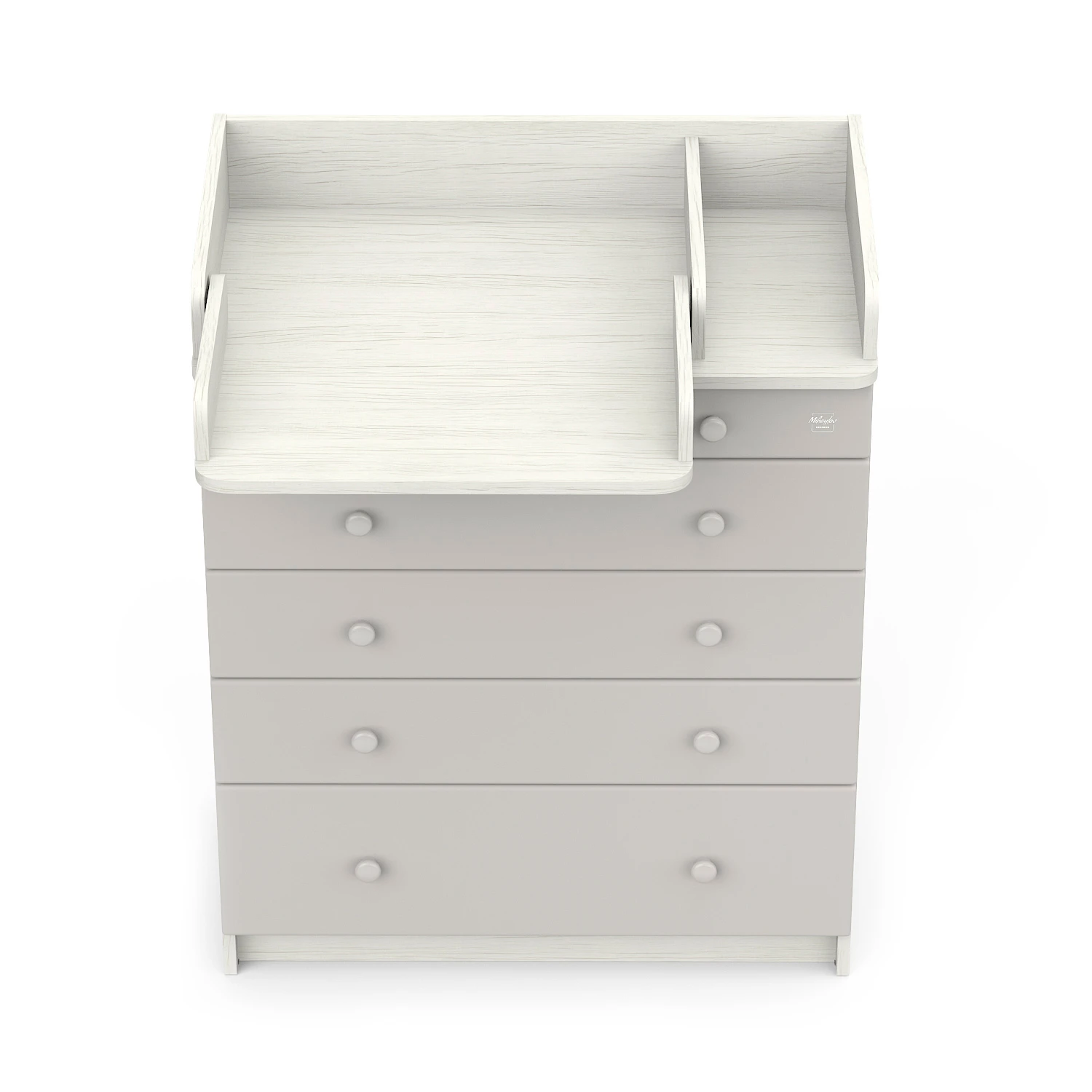 В комоде используется пеленальный столик с простым и надежным, скрытым механизмом раскладывания. Есть отделение рядом с пеленальным столиком для средств по уходу за малышом в быстром доступе.
