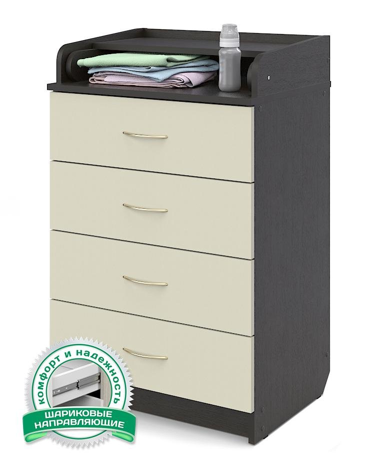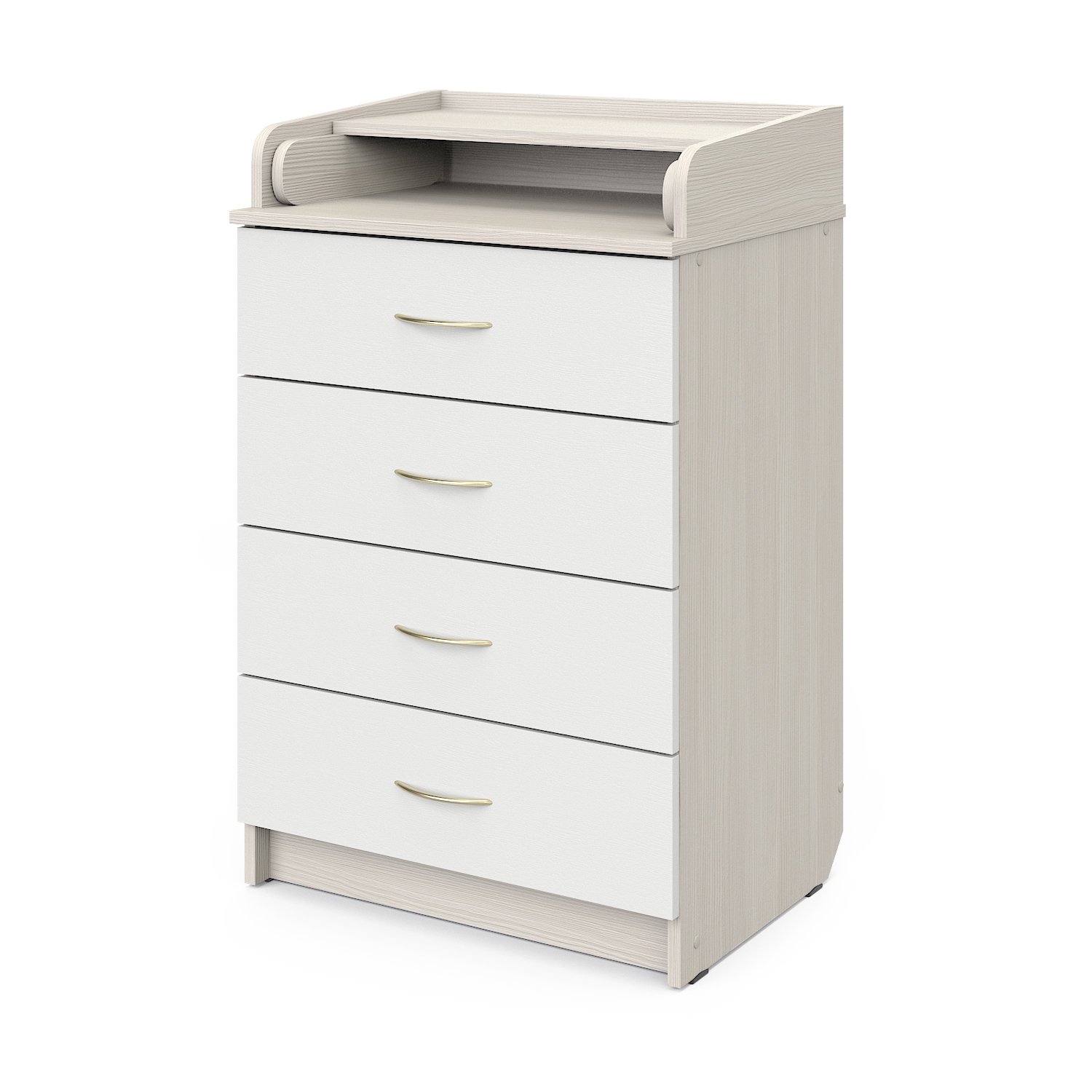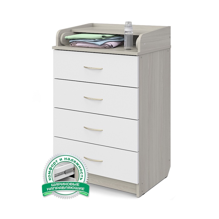 Комод Атон Сириус 604 ЛДСП - удобный, практичный, а главное компактный комод с 4 ящиками. Ширина комода всего 60 см, что экономит место и пространство в комнате. 4 вместительных ящика для детского белья оснащены роликовыми направляющими для плавного открытия/закрытия ящика. Пеленальный столик складной, при необходимости он раскладывается, образуя удобное и безопасное место для переодевания, а когда он не нужен - удобно складывается, образуя дополнительную полочку.
