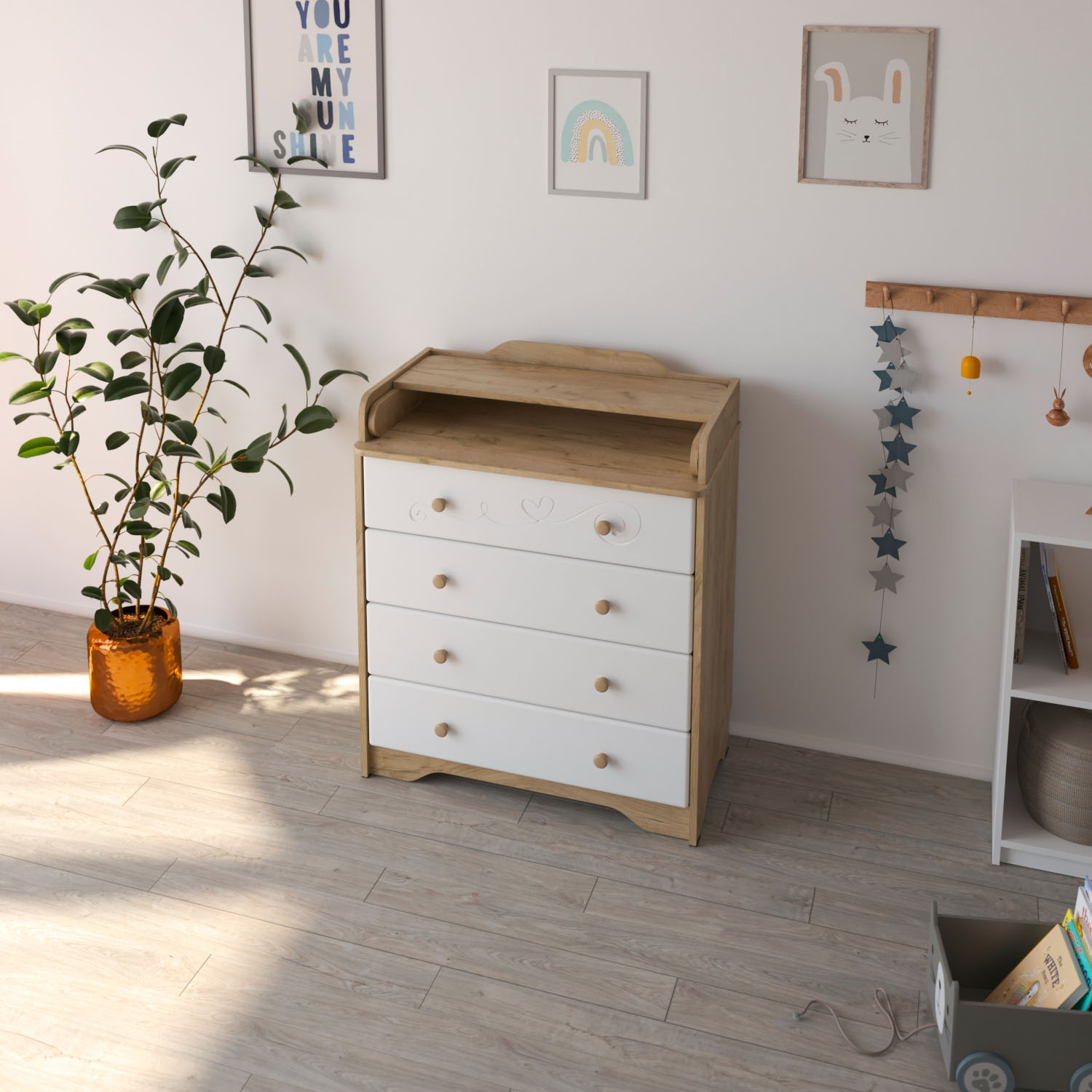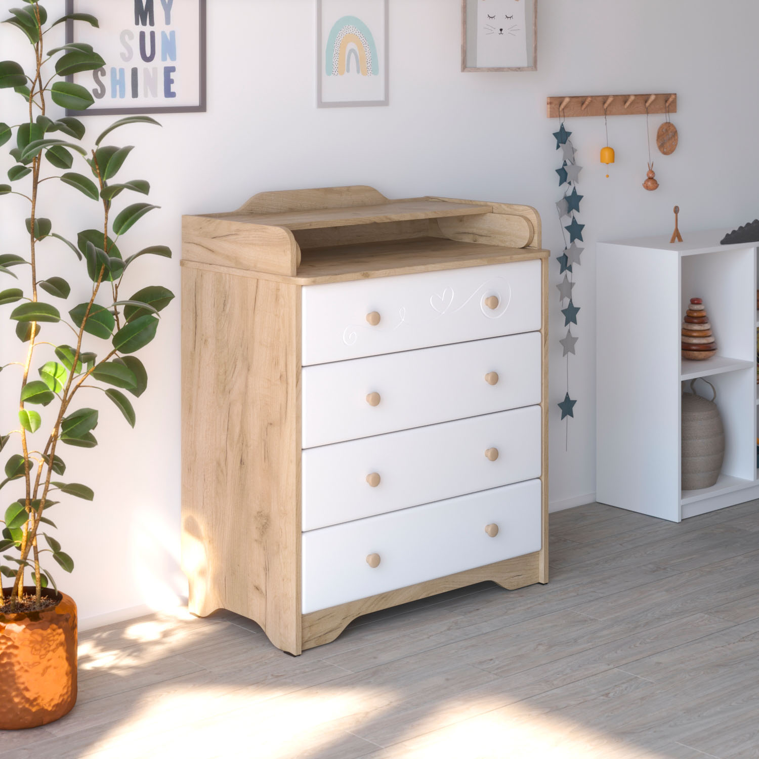 Комод Атон СИРИУС AIDEN с рисунком МДФ 800/4 (Атон СИРИУС ЭЙДЕН) - практичный и функциональный комод с элегантным рисунком на фасаде. Такой комод не только поможет в удобном хранении детских вещей, но и станет красивым аксессуаром в детской комнате. На верхней части комода расположен складной пеленальный столик. Комод не имеет острых углов и абсолютно безопасен для ребенка.