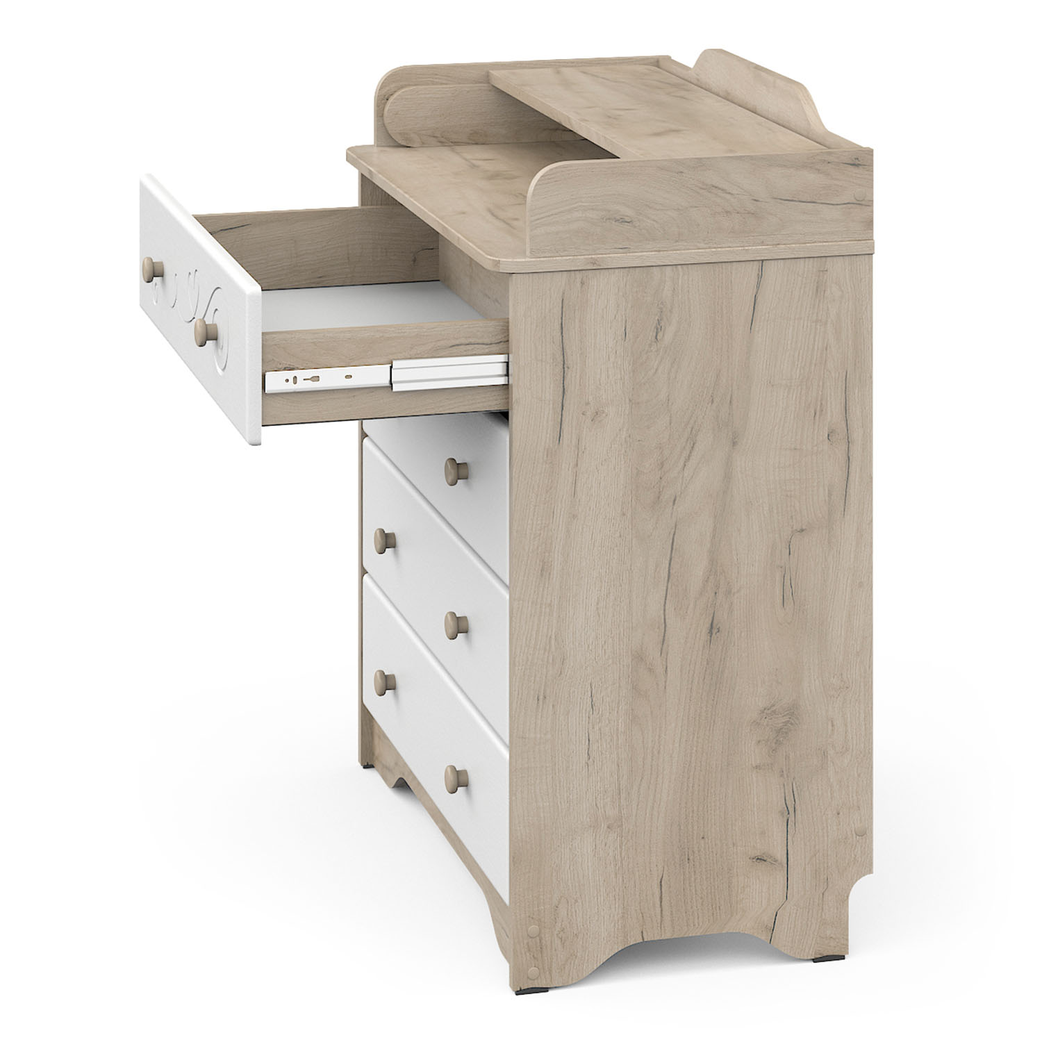 - В комоде используется скрытый и надежный механизм раскладывания пеленального столика.