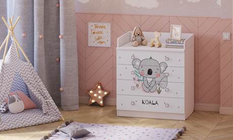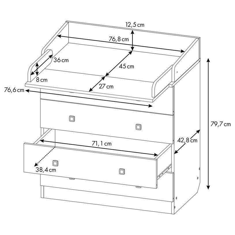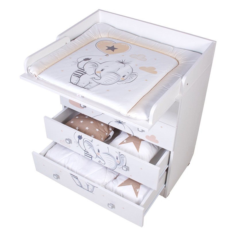 - Вместительные выдвижные ящики комода шириной 80 см с системой плавного закрытия позволят удобно хранить все детские принадлежности. Когда малыш вырастает из возраста пеленания, поверхность может быть снята, тогда комод приобретет классический вид.