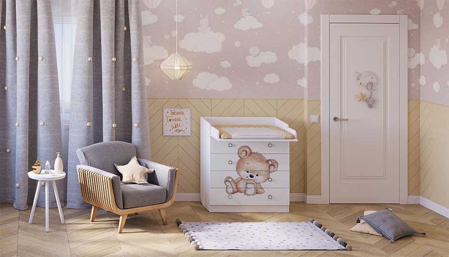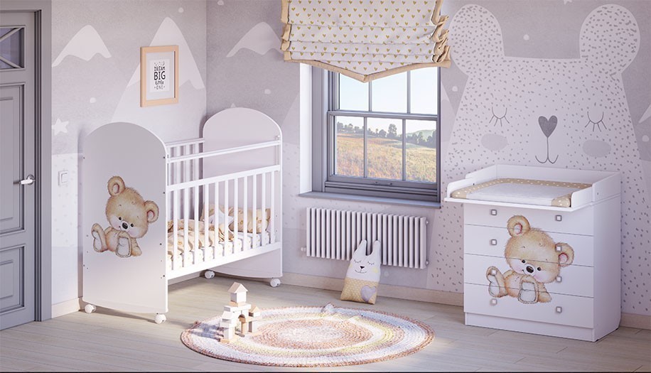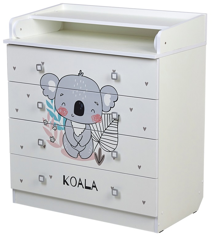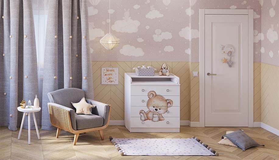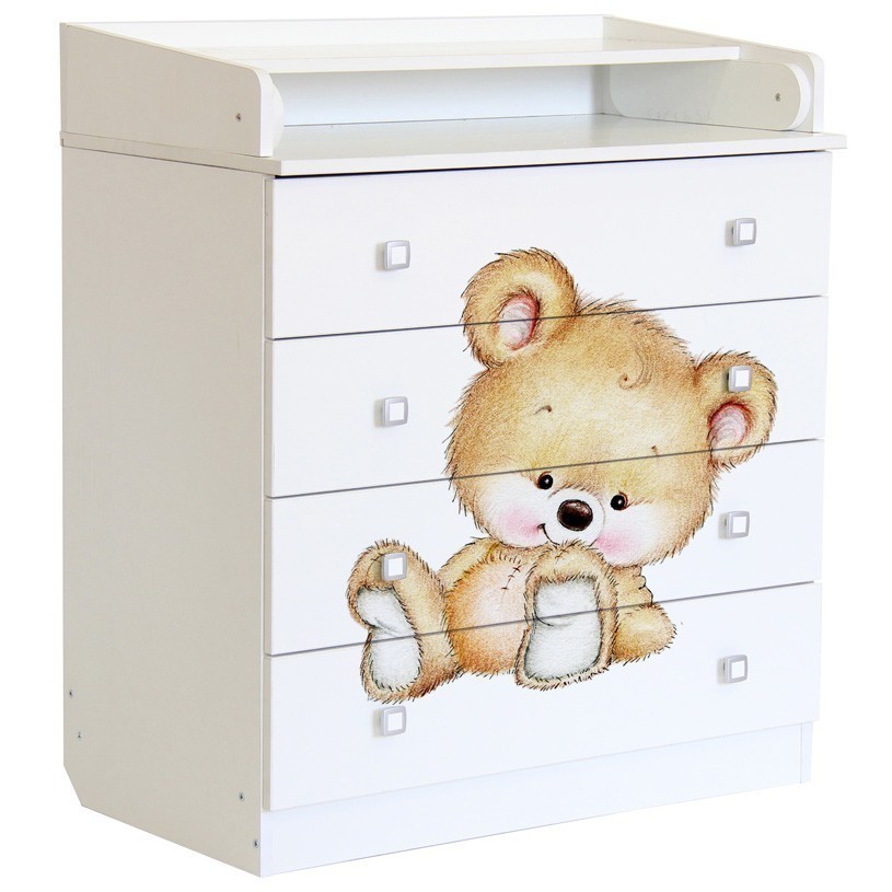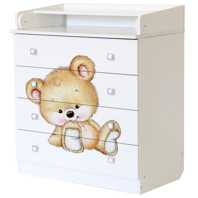 - Белый цвет модели наиболее популярен и хорошо впишется в любой интерьер. Рисунок в виде медвежонка делает комод оригинальным.