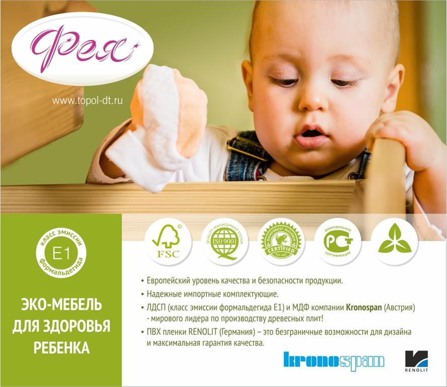 - Фасад и корпус выполнен из ЛДСП производства Kronospan (Австрия). Ламинированная поверхность экологична и устойчива к влаге, что важно учитывать при покупке детской мебели.