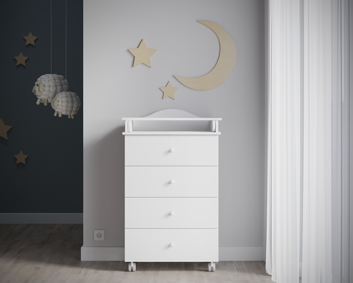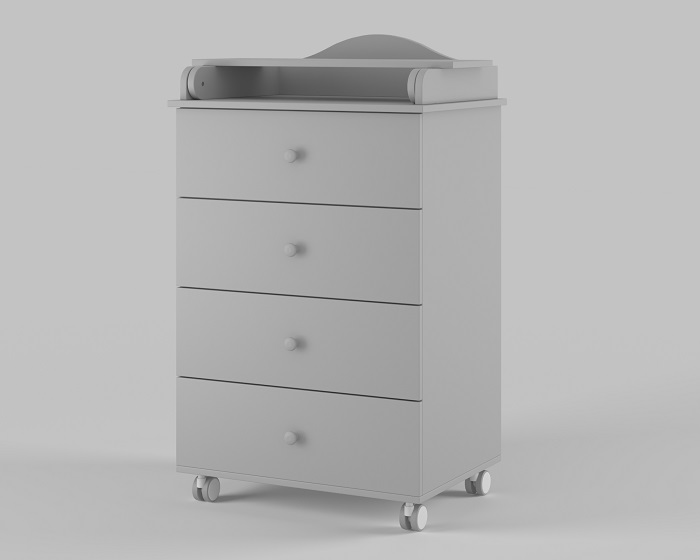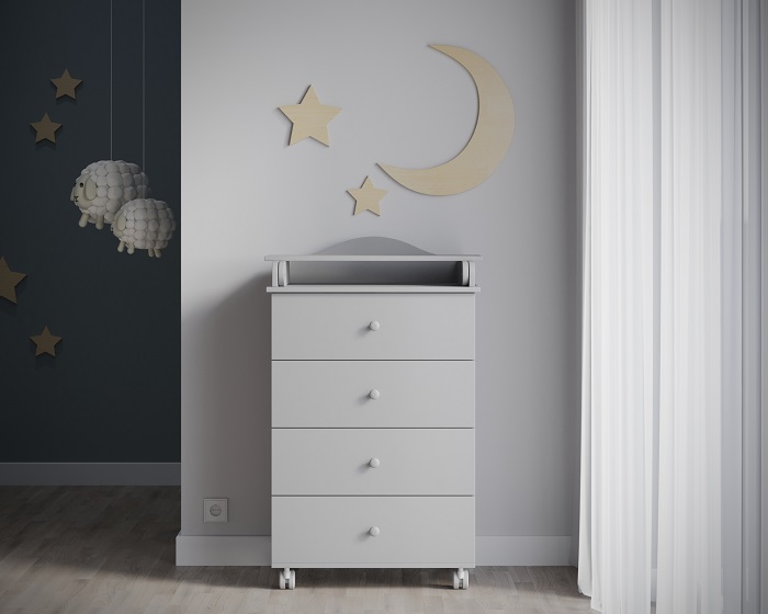 Сам комод, несмотря на небольшие размеры, оснащен 4 вместительными ящиками с бесшумным ходом и удобными ручками, которые полностью безопасны для малыша.