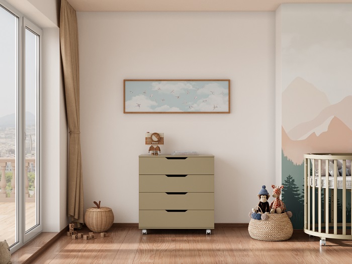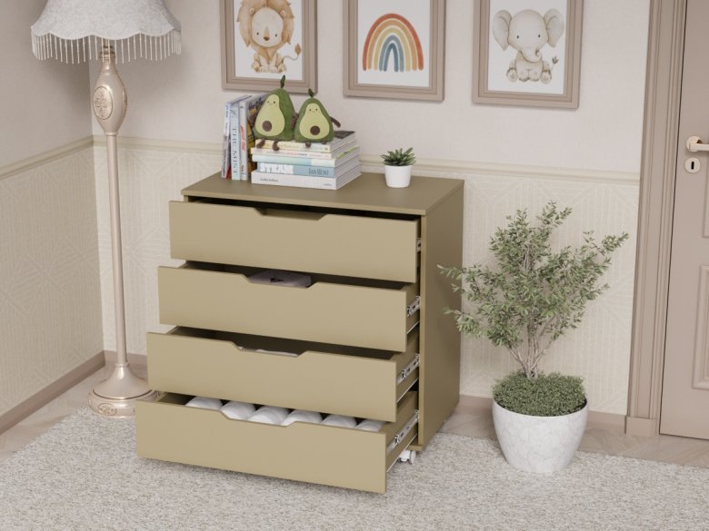 Комод оснащен 4 вместительными ящиками с удобными ручками-выемками. Такие ручки - это современное и безопасное решение для детской комнаты. Они смотрятся стильно и оригинально, при этом малыш не удариться об ручки и не прищемит себе пальчики.
