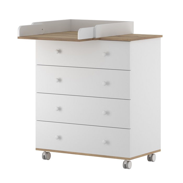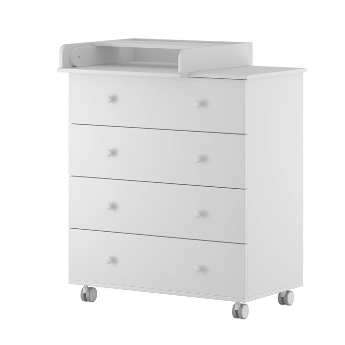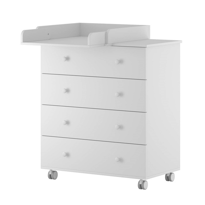 Вместительный комод с шириной 80 см оснащен 4 выдвижными ящиками. Самый верхний ящик поделен на секции (органайзер), что позволит удобно разместить небольшие вещи для ребенка: косметику для малыша, носочки, бодики, и тд. Все ящики оснащены шарикоподшипниковыми направляющими, что позволит ящиками удобно открываться и закрываться, а так же выдерживать большие нагрузки.