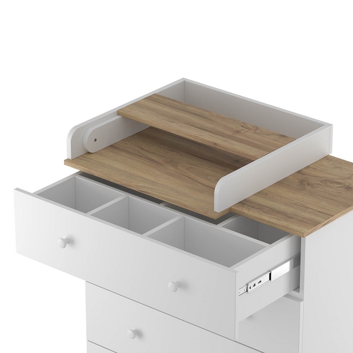 - Складной пеленальный столик. В дальнейшем пеленальный столик можно использовать в качестве дополнительной полочки под аксессуары, или полностью его демонтировать, продолжив использовать комод в классическом его стиле.