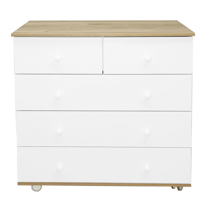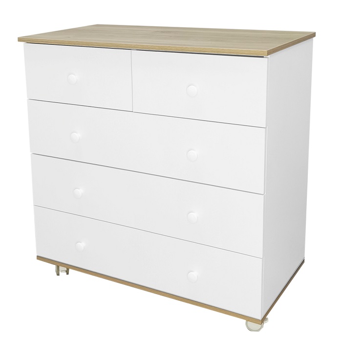Вместительный комод с шириной 80 см оснащен 5 выдвижными ящиками. Все ящики оснащены шарикоподшипниковыми направляющими, что позволит ящиками удобно открываться и закрываться, а так же выдерживать большие нагрузки.