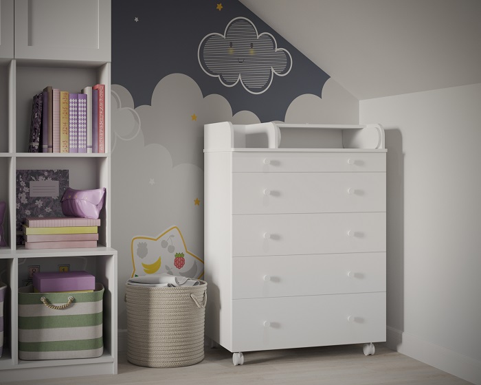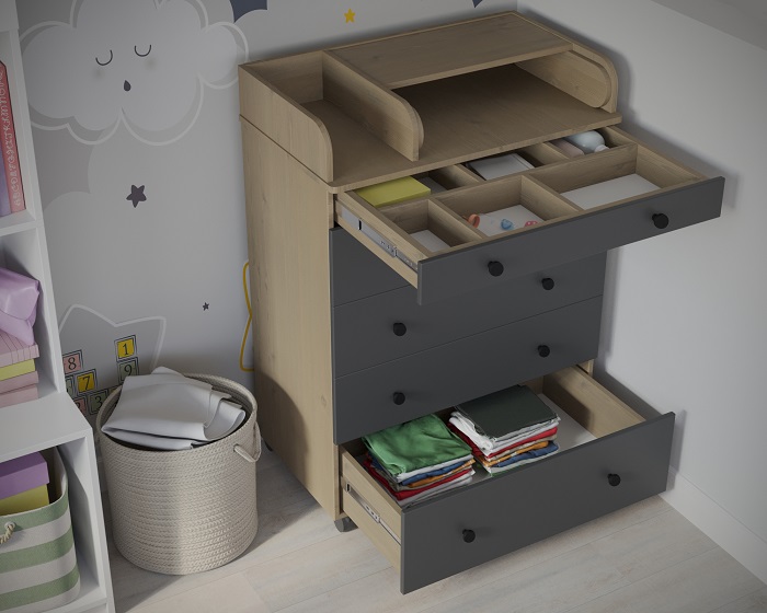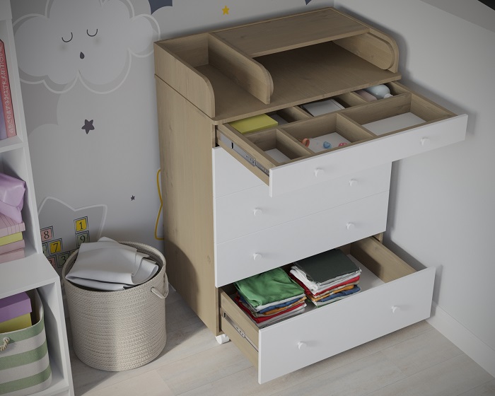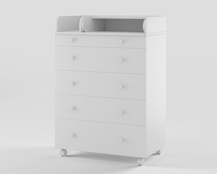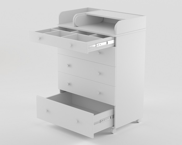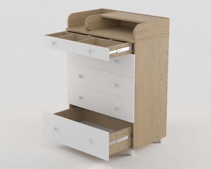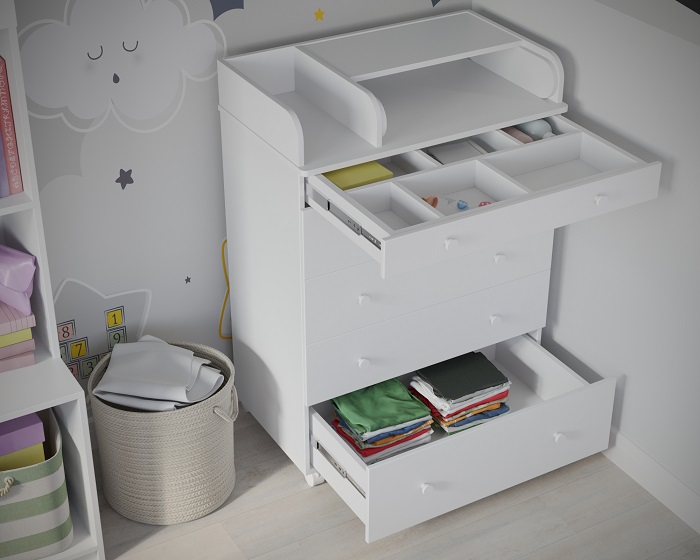 На комоде расположен складной пеленальный столик, который в сложенном виде может использоваться как дополнительные полочки. Рядом с пеленальным столиком есть удобное место для аптечки и гигиенических средств ребенка. В разложенном виде пеленальный столик очень удобен, имеет высокие бортики безопасности. Пеленальный столик позволит маме осуществлять все необходимые гигиенические процедуры для ребенка, переодевание, пеленание, на удобной для нее высоте.