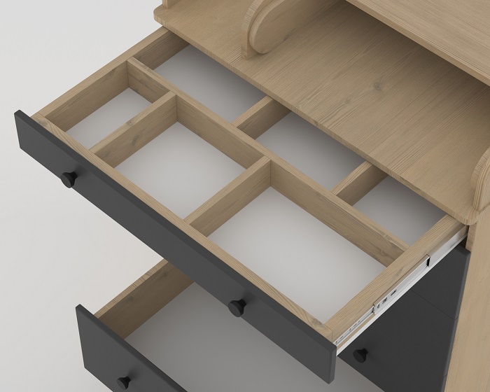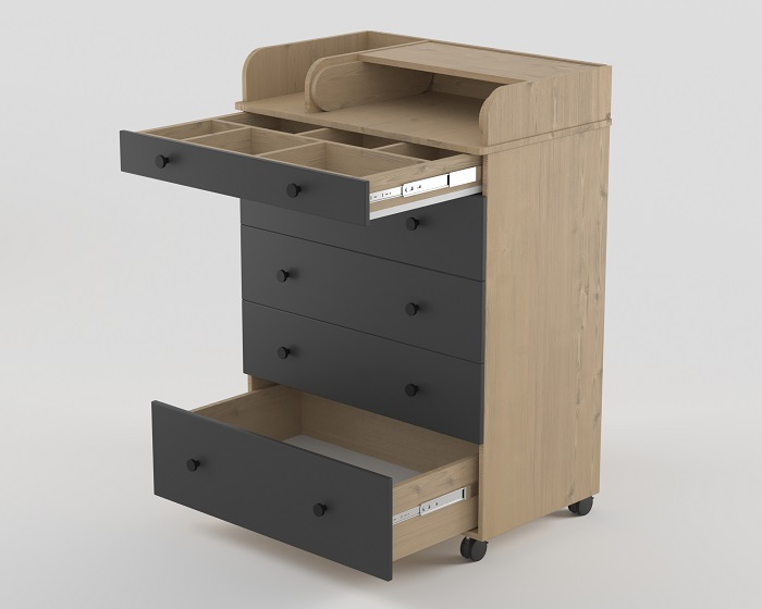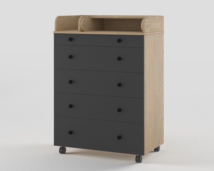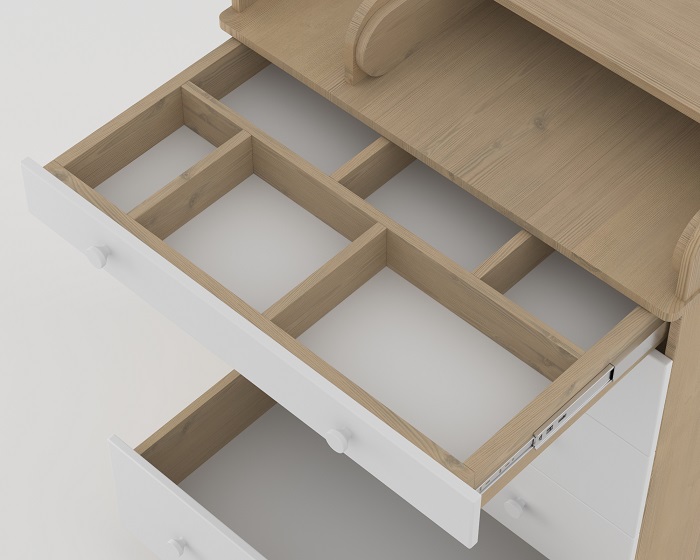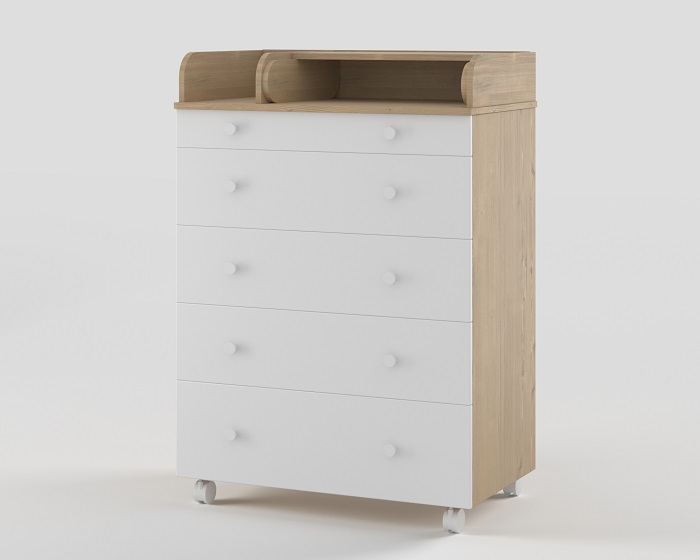 Комод состоит из 5 вместительных ящиков. Верхний ящик имеет небольшую высоту и выполнен в виде органайзера с большим количеством отделов. Такой ящик будет полезен для детской косметики и небольших вещей, как соски, пустышки, грызунки, носочки, бодики. Нижний ящик, увеличенных размером, отлично подойдет для больших объемных вещей, например, комбинезоны, одеялки, бортики для кроватки и тд.