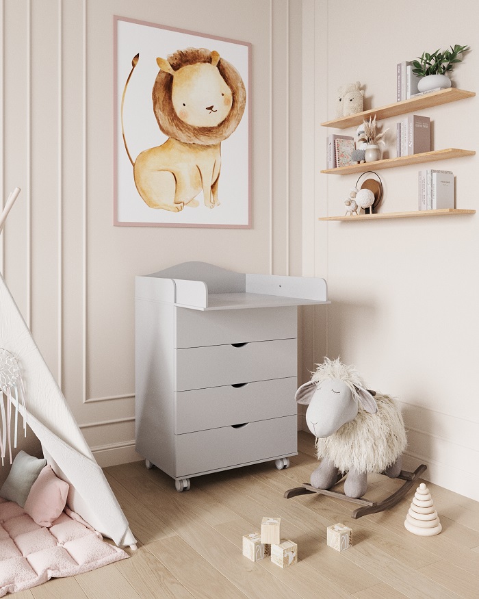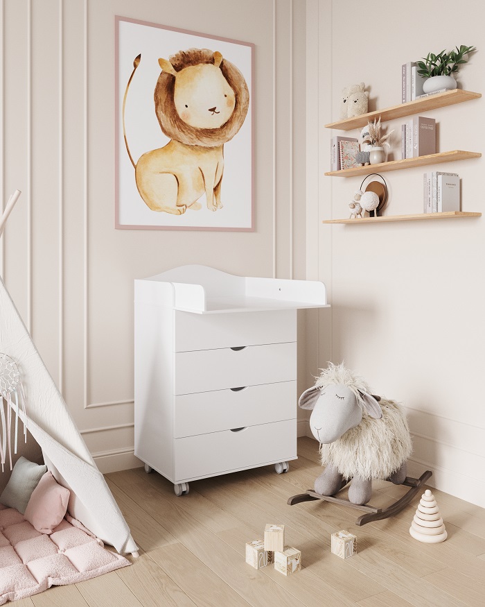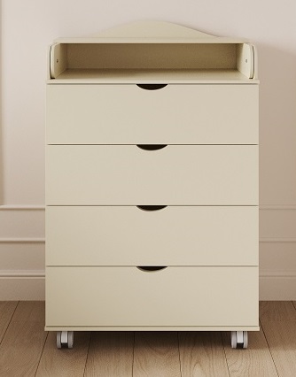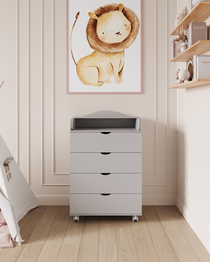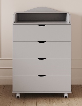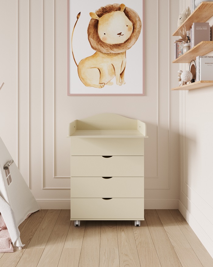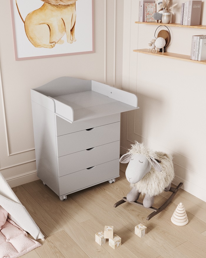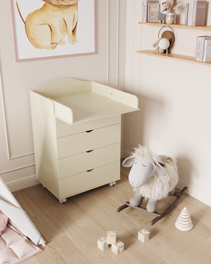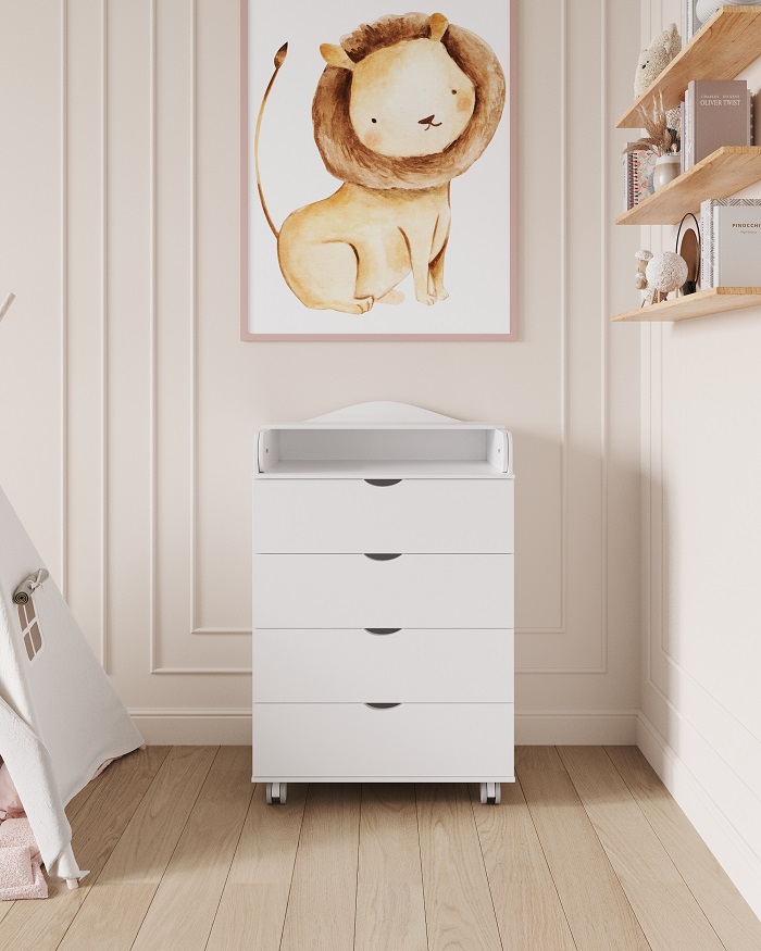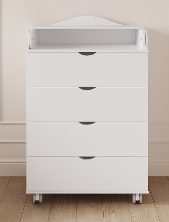 Корпус комода выполнен из ламинированной древесностружечной плиты (ЛДСП), отличающейся 100% экологичностью и долговечностью. Четыре вместительных ящика с интегрированными ручками можно использовать для хранения детской одежды и гигиенических принадлежностей. Комод может быть установлен на прорезиненные колеса с фиксатором, которые идут в комплекте, для быстрого и комфортного перемещения.