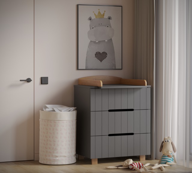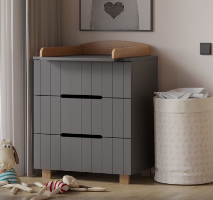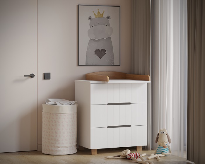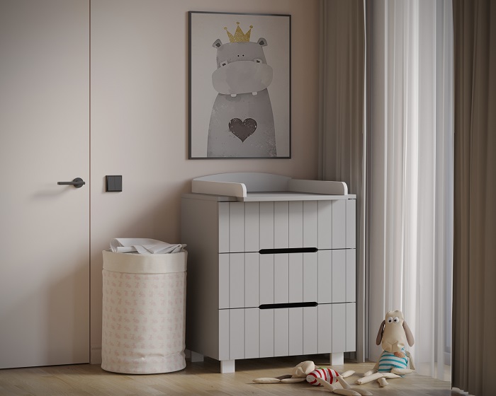 - как пеленальный комод, с установкой на поверхность комода специальной пеленальной рамки ( в комплекте). Рамка легко устанавливается на комод с любой стороны (справа, слева, посередине) организуя удобное и безопасное место для переодевания, пеленания ребенка. Использование комода для переодевания ребенка экономит пространство в комнате, ведь не нужно покупать дополнительно пеленальный столик или специальный пеленальный матрас, и позволяет маме общаться с ребенком на удобной для нее высоте.