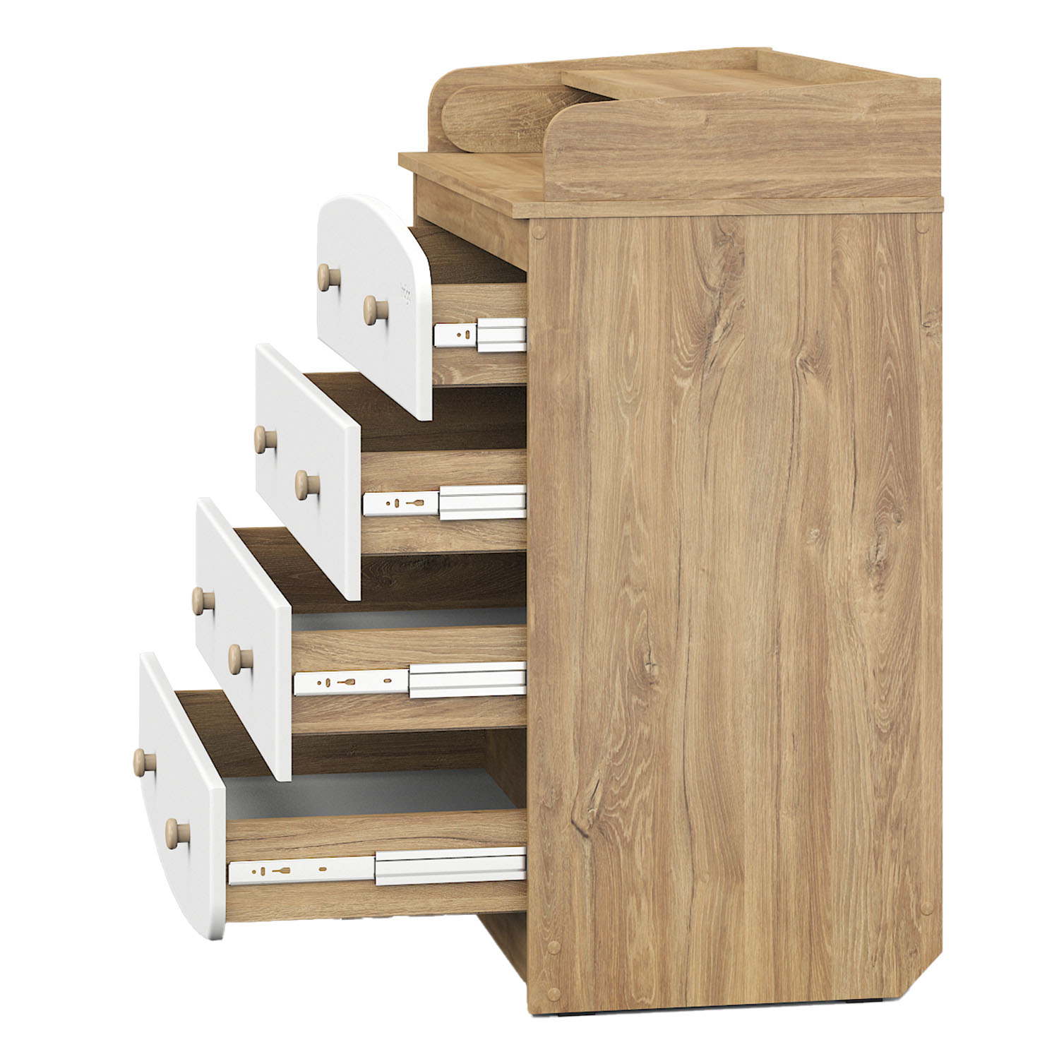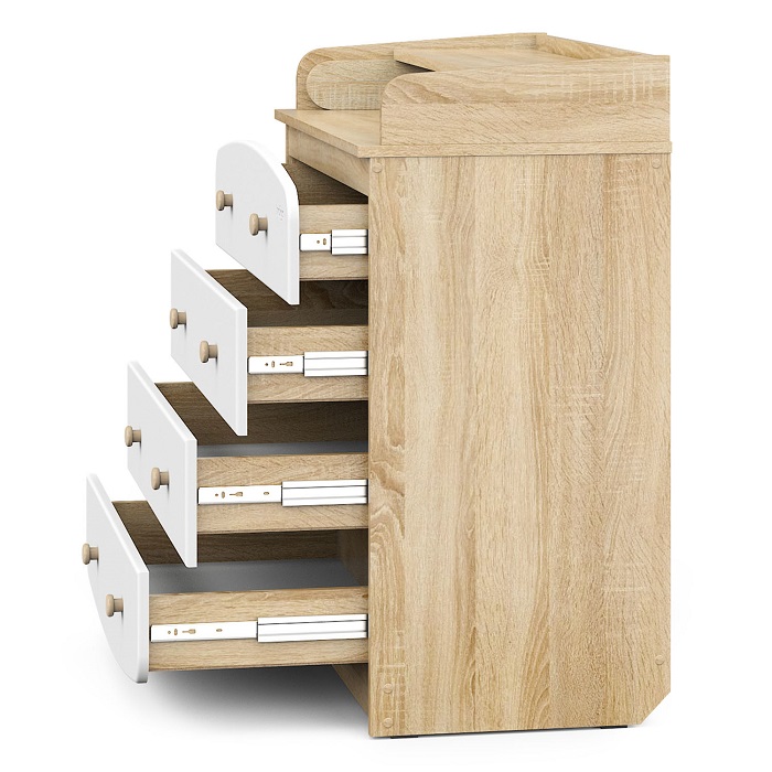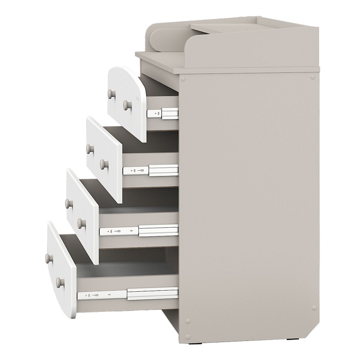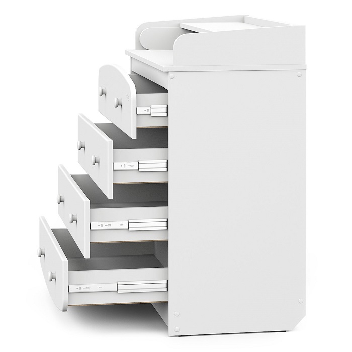 Все ящики комода оснащены бесшумными шариковыми направляющими, которые обеспечат удобный доступ к вещам и не потревожат сон ребенка.