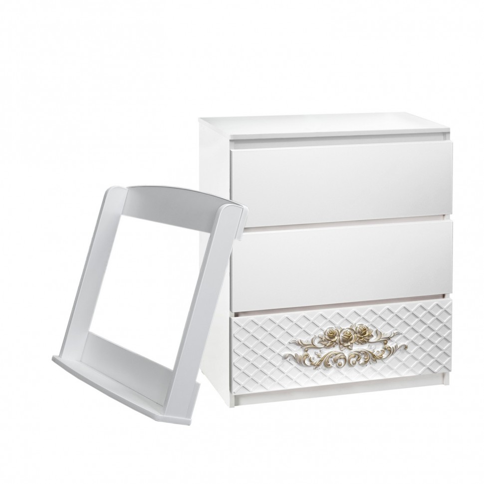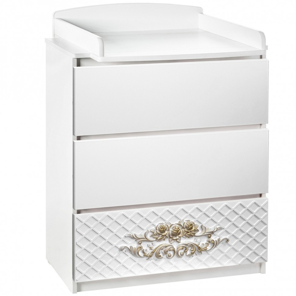 Комод пеленальный Островок уюта EVA Розарий - качественный, удобный и функциональный комод со съемной пеленальной поверхностью. Комод имеет по-настоящему великолепный дизайн, и украшен розами 3D с патинированием ручной работы. Пеленальный столик надежно устанавливается на комод и поможет организовать удобное место для пеленания и одевания ребенка. В дальнейшем столик легко снимается.