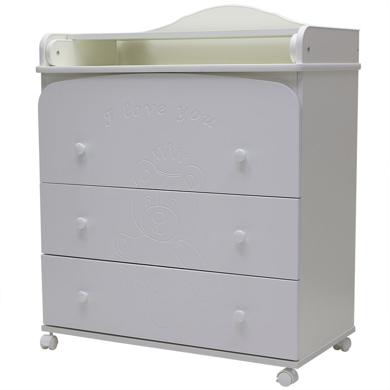 Комод пеленальный Топотушки Каролина 800/3 (арт. 80) - практичный и удобный комод с 3 вместительными ящиками. Его главная отличительная черта - большой верхний ящик, куда без труда влезут одеялки, пледы, подгузники или другие объемные вещи для ребенка. Все ящики выдвигаются бесшумно и очень удобно. На фасаде комода изображен мишка, что, несомненно, понравится ребенку и создаст более сказочную атмосферу в детской комнате. Комод оснащен пеленальным столиком, который легко раскладывается и складывается при необходимости. Если ребенок вырос, то пеленальную поверхность можно полностью снять. Комод оснащен колесами, 2 из которых со стопорами, так же для дополнительной безопасности есть крепление комода к стене.