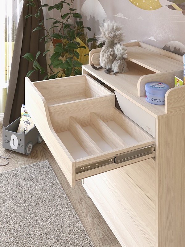 Интересным дизайнерским элементом является двухуровневый органайзер. Он позволит более удобно разместить небольшие вещи для малыша.